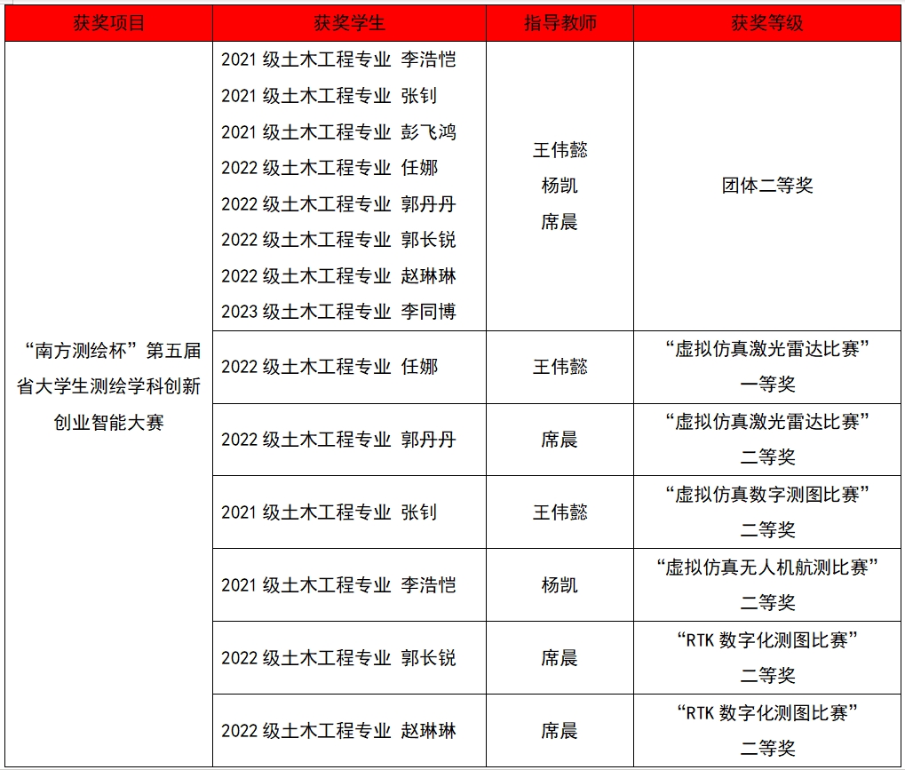铁道学院土木工程专业师生代表学校参赛,首次参加团体赛即获二等奖,同时在单项虚拟仿真激光雷达赛中获一等奖,在虚拟仿真数字测图、虚拟仿真无人机航测等比赛中获二等奖5项,实现全部单项赛道获奖全覆盖,获奖级别、人数均取得新突破,展现了学生测绘综合和虚拟仿真技能,彰显了应用型人才培养和学科专业建设成果。