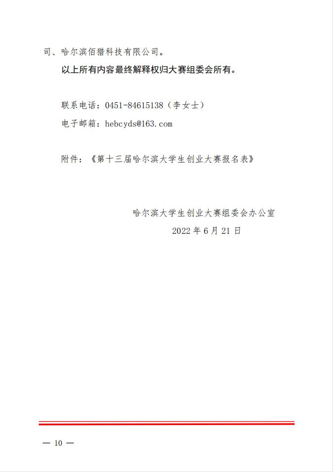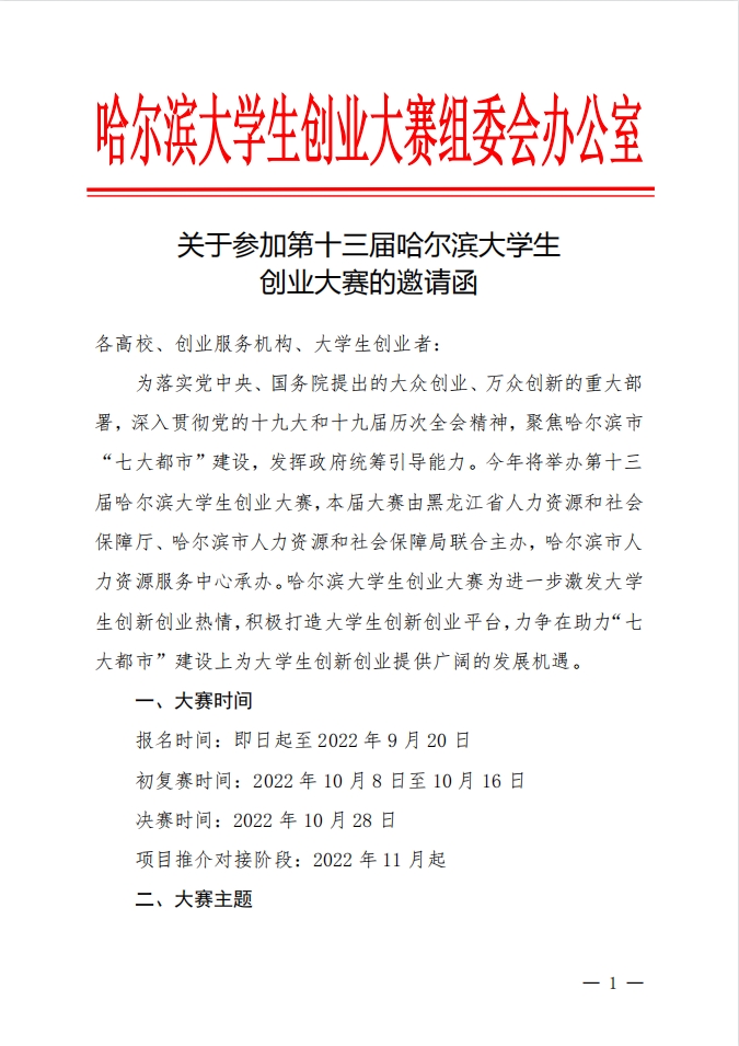 由哈尔滨大学生创业大赛组委会办公室组织的“第十三届哈尔滨大学生创业大赛”,请符合参赛要求的同学积极进行申报,报名截止时间为9月20日,电子版材料发送至邮箱jwcdczx@hibu.edu.cn,纸质版材料提交至大学生创新创业指导中心。