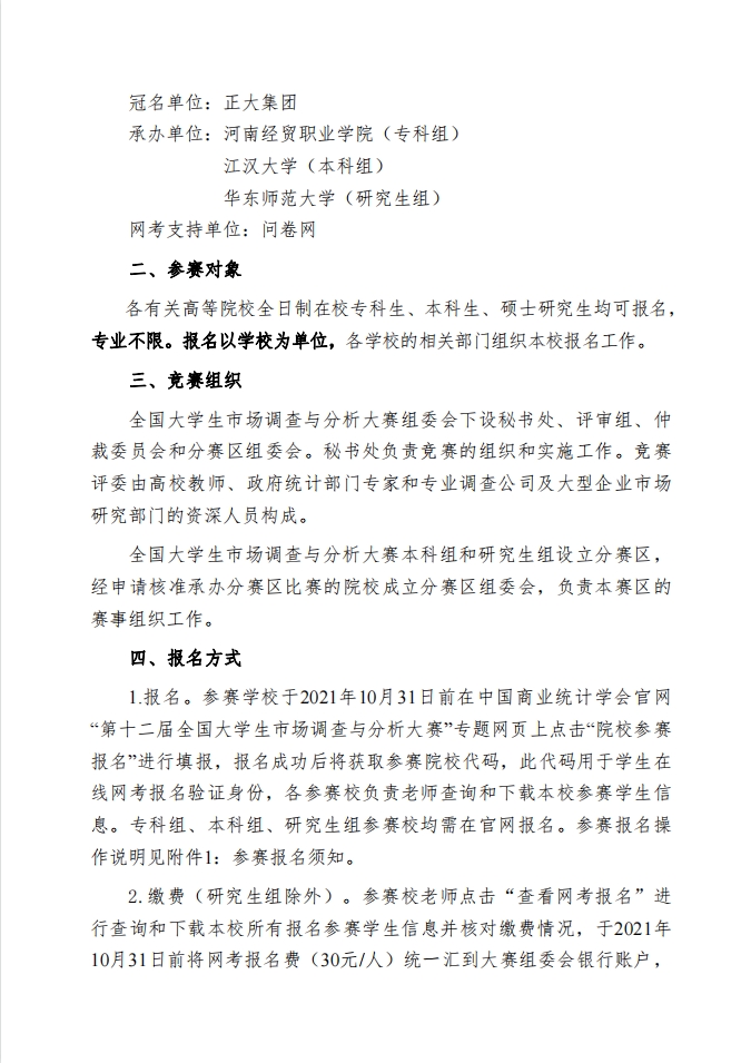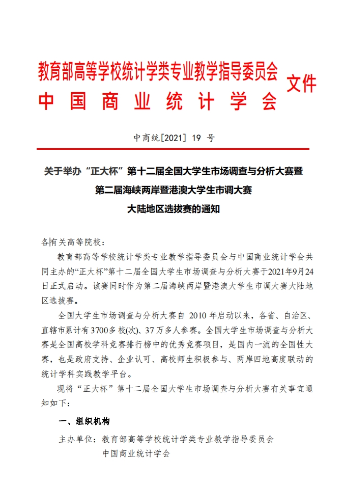 由教务部高等学校统计学类专业教学指导委员会和中国商业统计学会共同举办的“正大杯”第十二届全国大学生市场调查与分析大赛暨第二届海峡两岸暨港澳大学生市调大赛,现转发相关文件内容,请感兴趣的同学按照比赛要求,于10月30日前按照比赛要求进行报名,报名成功后请到大学生创新创业指导中心赵俊哺老师处备案。