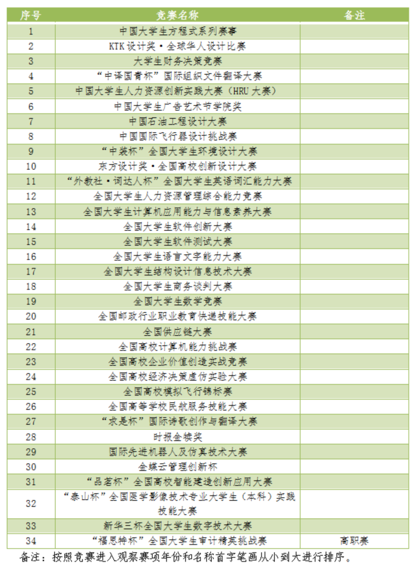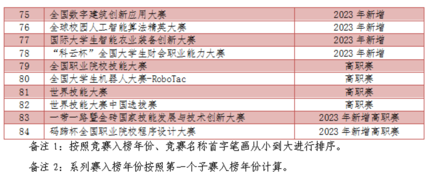 2022年9月30日,中国高等教育学会发布《关于征集高校大学生竞赛的通知》,通过竞赛主办单位自愿申报,专家工作组形式审查、网络初审和会议复审等环节,共有26项本科独立赛事、1项系列赛子赛事和2项高职赛事,合计29项新增列入《2023全国普通高校大学生竞赛分析报告》竞赛目录;33项本科赛事和1项高职赛事,合计34项列入《2023全国普通高校大学生竞赛分析报告》观察目录。