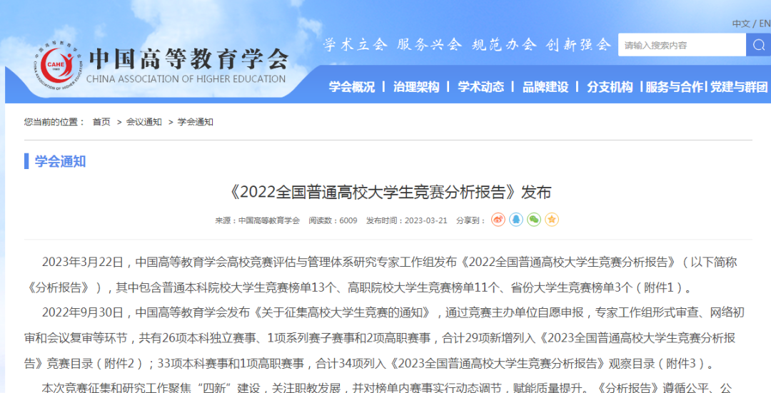 2023年3月22日,中国高等教育学会高校竞赛评估与管理体系研究专家工作组发布《2022全国普通高校大学生竞赛分析报告》(以下简称《分析报告》),其中包含普通本科院校大学生竞赛榜单13个、高职院校大学生竞赛榜单11个、省份大学生竞赛榜单3个。