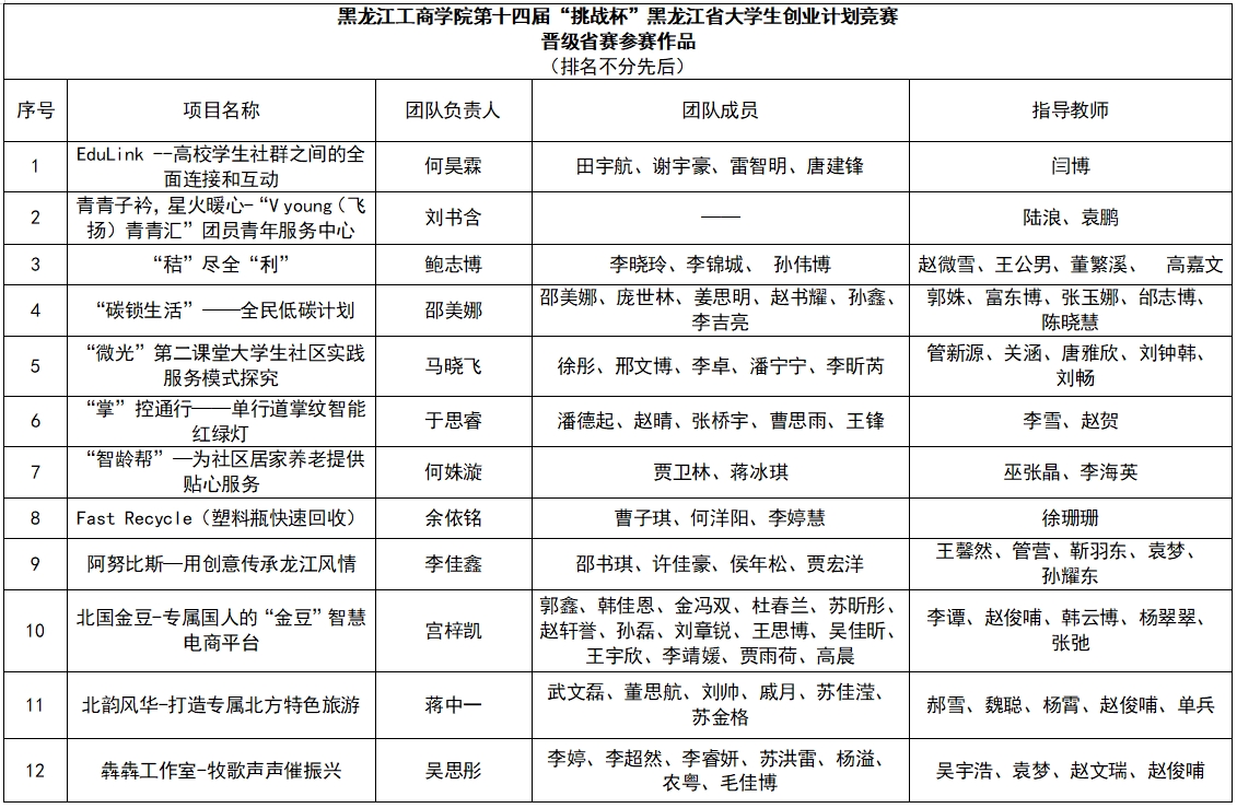 根据第十四届“挑战杯”中国大学生创业计划竞赛评审要求(见附件1)及可推荐名额要求,经各院、部推荐,校内外专家评审,评选出60项参赛作品拟报送省赛复赛,现将参赛项目公示如下: