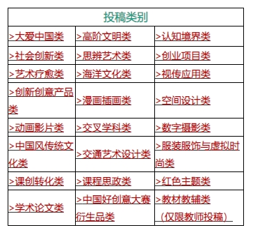 (本届大赛学生组共设23个投稿类别,以每个院校不同的二级学院(系)为投稿单位,每个类别(论文类除外,论文类每个学生或老师,只能投稿一篇论文,且为未发表过,以及与创意、设计、数字媒体等相关专业有关的文章)最多投搞20件作品;教师组24个类别,教师作品投稿数量不限)。