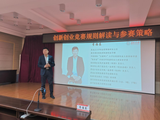 创新创业学院于10月8日上午9:00在松北校区第一教学楼631室举办名师讲座。本期特邀请到黑龙江大学创业管理教研室主任、教育部首批优秀创新创业导师、中国国际“互联网+”大学生创新创业大赛国赛评委、“创青春”中国青年创新创业大赛国赛评委、黑龙江省创业教育学会副秘书长李海东老师作为主讲人。共计80余名师生通过线下、线上的方式参加了本次活动,活动由创新创业学院院长杨霄主持。