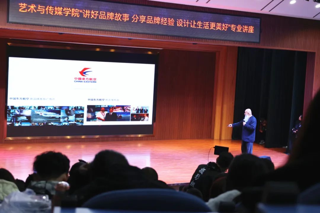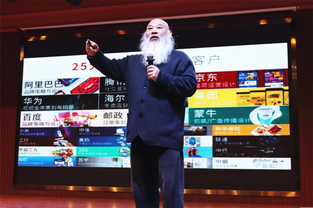 陈丹教授以《讲好品牌故事分享品牌经验》为主题,从“设计、策略、品牌、创意”四个方面,分享了正邦创意公司从“文化人作坊”到“文学性思维”再到“现代企业管理”发展蝶变,伴随着企业成长从“创意人、设计师向企业管理者”自身角色转变的奋斗历程,并以设计CCTV、中国电信等诸多标志为例,娓娓讲解了品牌的内涵、构建以及设计旨趣。