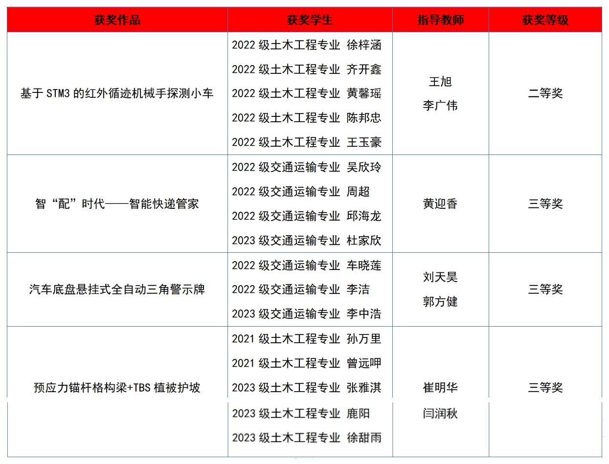 日前,由省高等教育学会主办,东北林业大学承办的第四届“维脉杯”黑龙江省交通运输科技大赛落下帷幕。经初赛选拔,我校7支代表队与来自哈工大、哈工程、东林等30余所高校的56支队伍一同入围决赛,经过激烈角逐,最终获得二等奖1项、三等奖3项的好成绩。