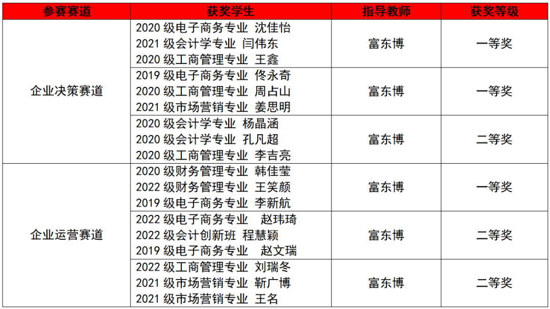 据悉,本届赛事活动由黑龙江省高等教育学会主办,齐齐哈尔大学承办,商学院师生连续四年参加该项赛事,共获得一等奖6项、二等奖7项、三等奖2项。2022年,商学院师生先后在“学创杯”、“新道数智人才杯”、“踏瑞杯”等专业赛事中喜获国家级奖项9项,省级奖项30项,获奖等级、数量再创新高。