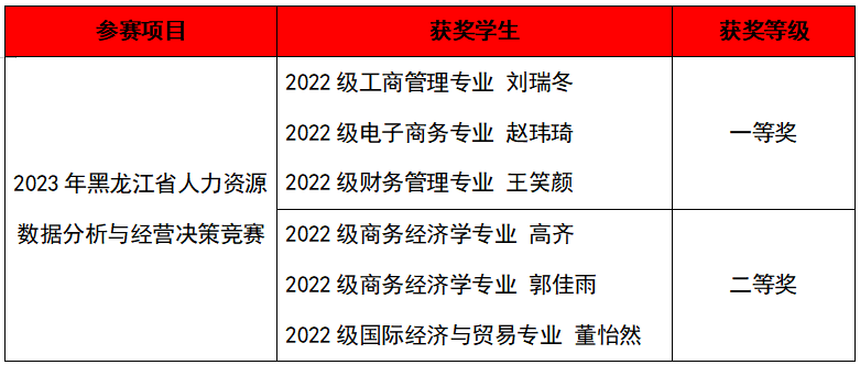6月25日,由省教育厅高等教育处支持主办,省创新创业教育指导委员会主办的2023年黑龙江省人力资源数据分析与经营决策竞赛线上落下帷幕,商学院派出2支队伍代表学校参赛,喜获一等奖1项(一等奖仅有2项),二等奖1项的好成绩,并获得2023“一带一路”暨金砖国家技能发展与技术创新大赛全国总决赛的参赛名额。