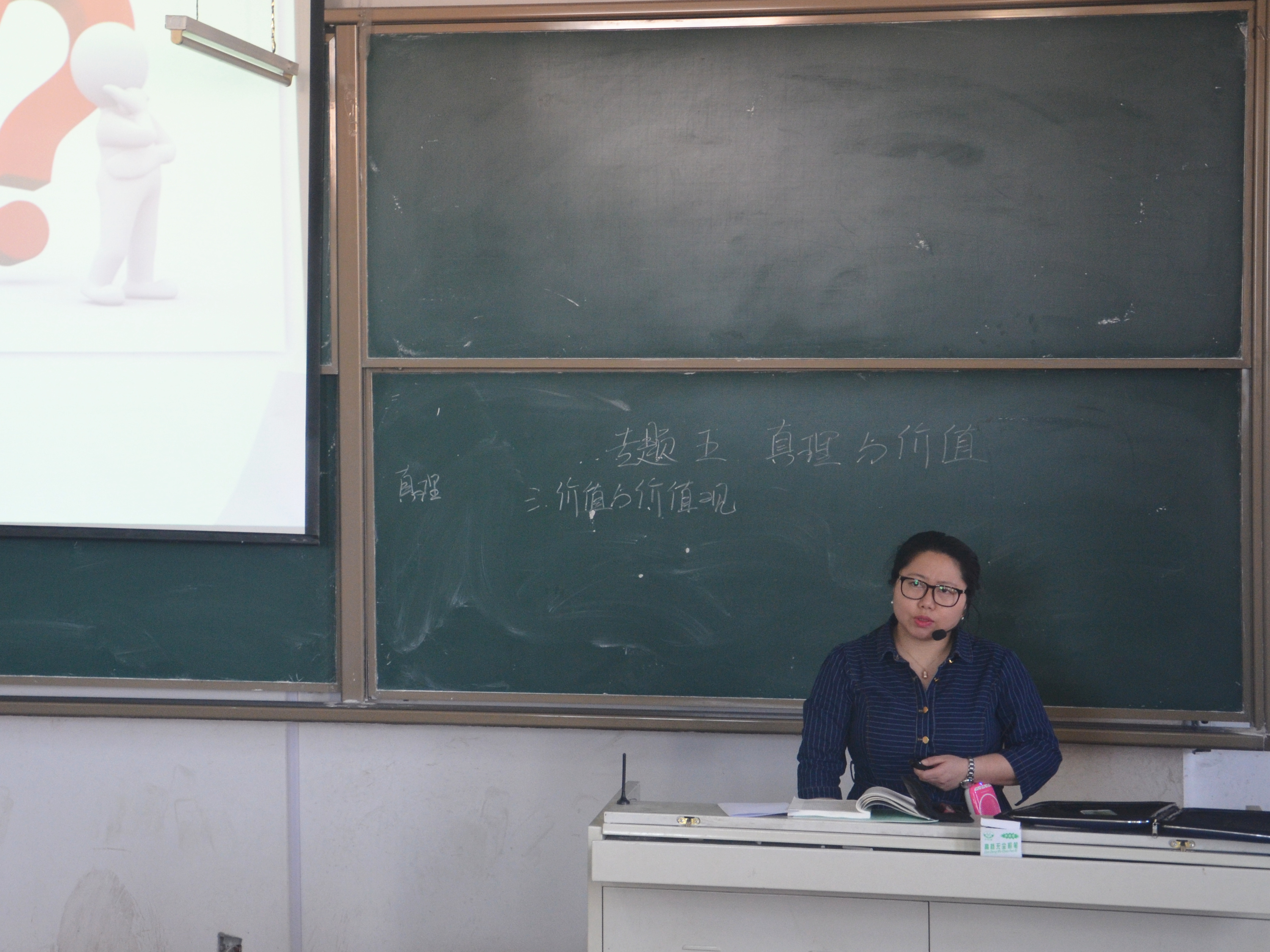 卢婧一首先带领学生回顾了上节课的知识要点“真理”,同时提出本节课的内容:价值与价值观。通过播放自己制作的视频短片,提问“选出你喜欢的几首歌曲”,导出大学生应该树立“正确的价值取向”这一主题。卢老师采用启发式、案例式教学方法,结合多媒体PPT图片展示,向同学们讲解了价值的含义及特性,讲解了“社会主义核心价值观”等重点内容。案例详实,贴近学生实际,在活跃的氛围中,师生开展了良好的互动交流。卢老师特别注重学生的素质教育的培养,并积极引导大学生树立正确的社会主义核心价值观等意识,引导学生将理论学习与专业实践相结合,将知识储备与能力提升相结合。