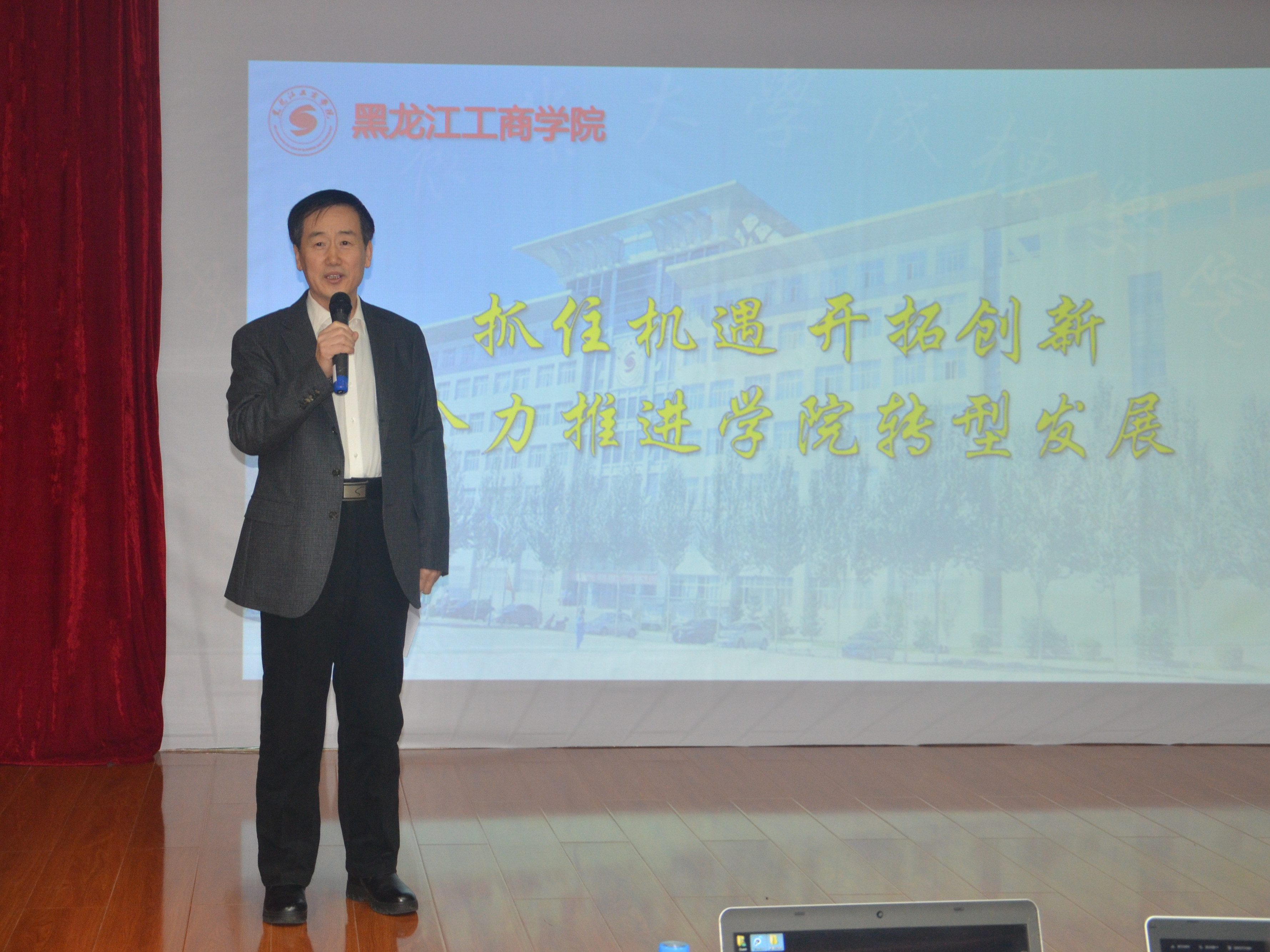 在学院胜利召开第一次党代会、第一届一次“双代会”之际,应学院院长、党委书记宋有的邀请,学院理事长、哈尔滨祥阁房地产开发有限公司董事长刘来祥博士,于12月 30日上午,在六楼会议作了“抓住机遇 开拓进取 全力推进学院转型发展”专题培训,学院主要党政领导出席会议,各系部办负责人、副科级以上行政干部、学工办主任、教研室主任聆听了培训。培训会由宋有主持。