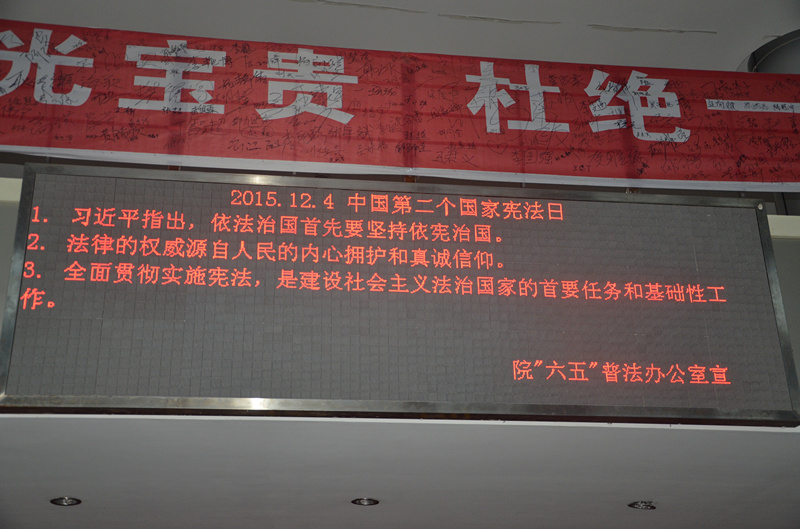 团委在12月4日当天,在学院教学楼门前、大厅电子屏悬挂、播放“增强宪法观念 、推进依法治国”等法治宣传横幅标语、资料等,营造法治宣传的氛围,并在宪法宣传周期间,利用校园广播宣传宪法知识系列报道等内容。