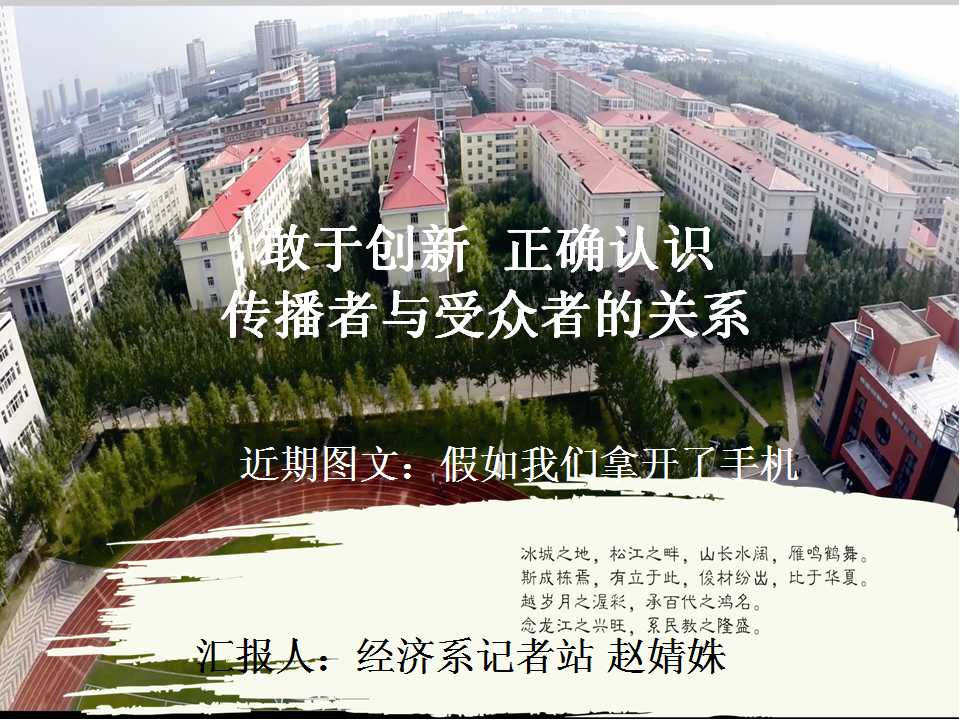 在宣传学风建设上,经济系记者站策划的主题为“假如我们拿开了手机”和“向考试作弊说不”,通过有针对性的摆拍,提出“手机”的话题,创造小新闻点,提升图文吸引力,让同学们在善意的玩笑和趣味性的图文阅读中,感受到学风宣传的温馨与温度。