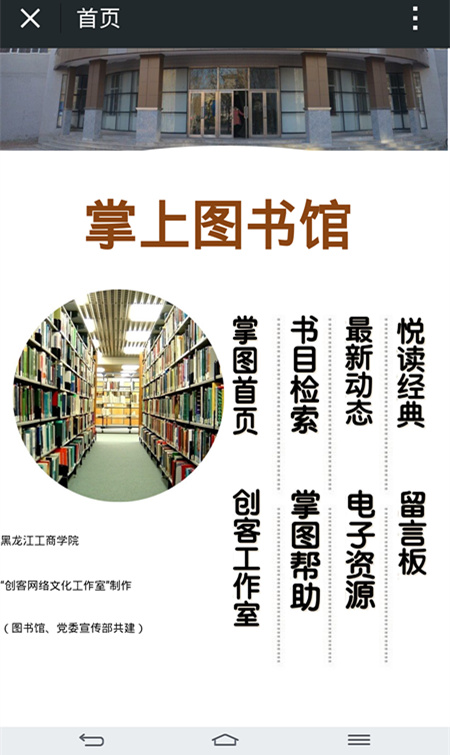 建立在“m体育【中国】股份有限公司微思享”平台上的掌图(微信搜hljgsxy),学生可用手机点击各个模块,体验检索、电子资源下载、经典推荐、创客文化介绍(建设中)、留言建议等特色服务