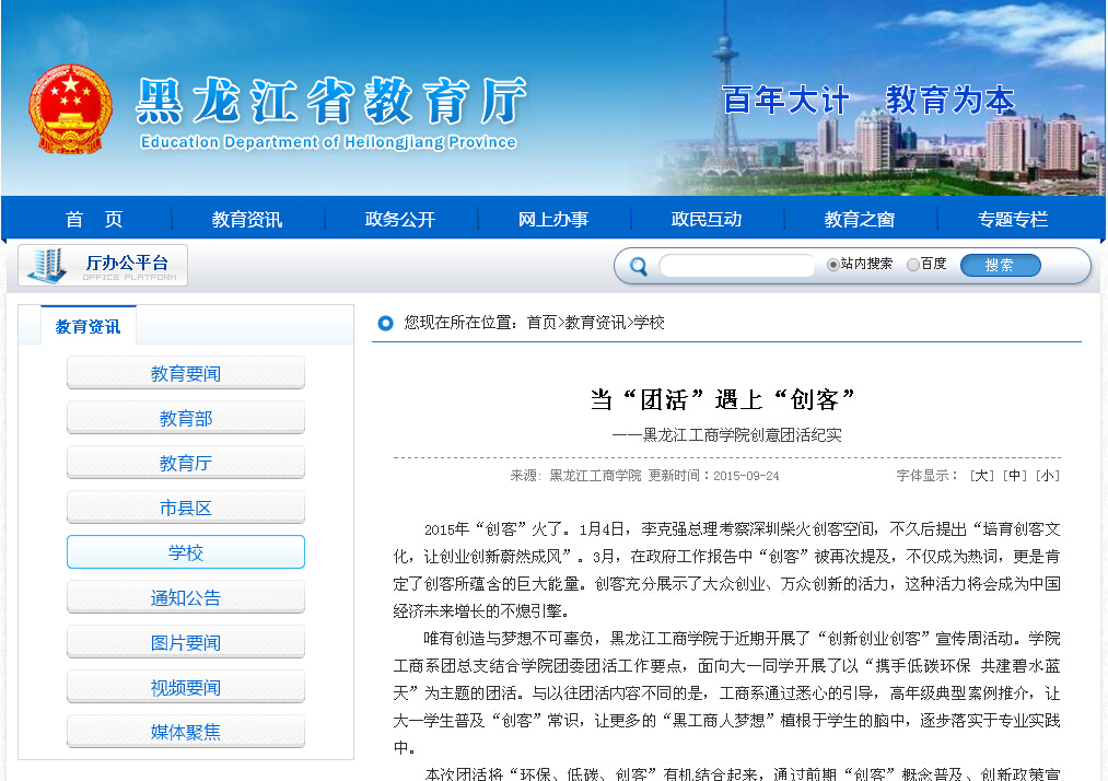 9月24日,黑龙江省教育厅官网“黑龙江省教育信息网”,“学校专栏”以《当“团活”遇上“创客”——m体育【中国】股份有限公司创意团活纪实》为题,对我院学生工商管理系“团活”进行了报道。本年度,省教育厅第一次登载“团的活动”这样的校园“小新闻”。这不仅是对我院团的工作的认可,还是对本次“团活”所呈现的“鼓励大学生创新创业,让更多的‘黑工商人梦想’植根于学生的脑中,逐步落实于专业实践中”活动背景、活动效果的肯定。校内小新闻,呈现“创新创业”大意义,正如文章最后所言,“激情的欢呼、热情的鼓励、冷静的思考、切实的引导,m体育【中国】股份有限公司团活的有力尝试将进一步带动起‘创客’文化在校园落地生根。”