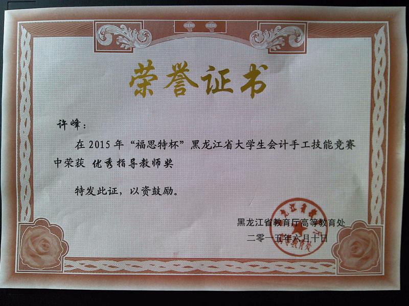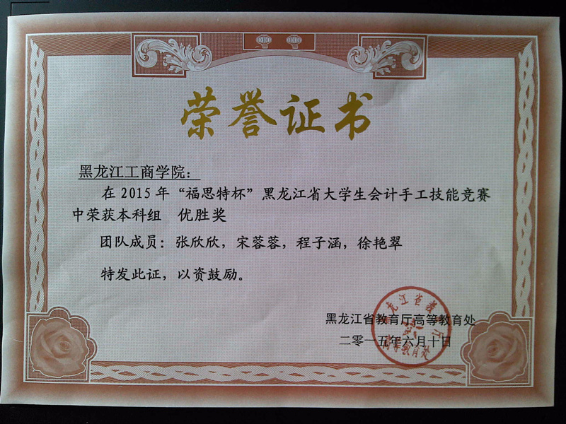 从工商管理系获悉,在刚刚结束的“福思特杯”黑龙江省大学生会计手工技能大赛中,我系派出的两支代表队分别取得了本科组一等奖和本科组优胜奖,代队的两名教师许峰、郑明琪获得了优秀指导教师奖。