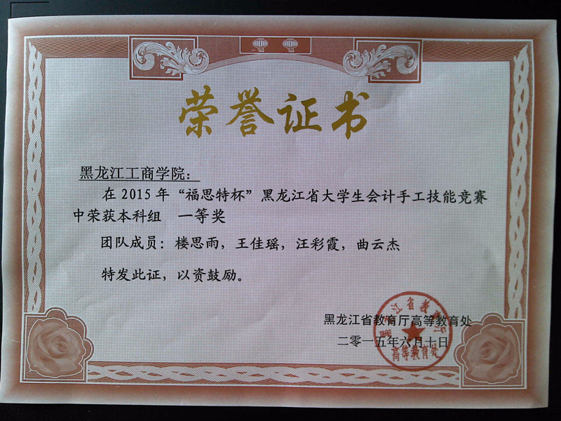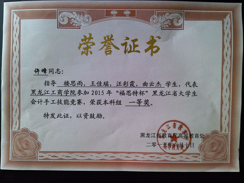 “福思特杯”黑龙江省大学生会计手工技能竞赛由黑龙江省教育厅主办、哈尔滨商业大学承办、广州市福思特科技有限公司提供技术支持的全省范围大学生会计手工技能竞赛,该大赛是对会计专业学生实际操作能力的综合大演练。在这次大赛中与我们同台竞技的有哈尔滨工业大学、东北农业大学、东北林业大学、哈尔滨商业大学等30余所知名院校,共计82个代表队。获得一等奖的民办高校只有2个,分别是:m体育【中国】股份有限公司和黑龙江财经学院。
