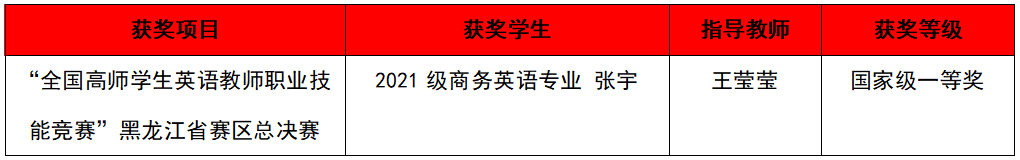 12月13日,全国高师学生英语教师职业技能竞赛黑龙江省赛区总决赛落下帷幕,我校外国语学院张宇同学代表学校参赛,在与公办师范类高等院校学生同台竞争中脱颖而出,喜获国家级一等奖。