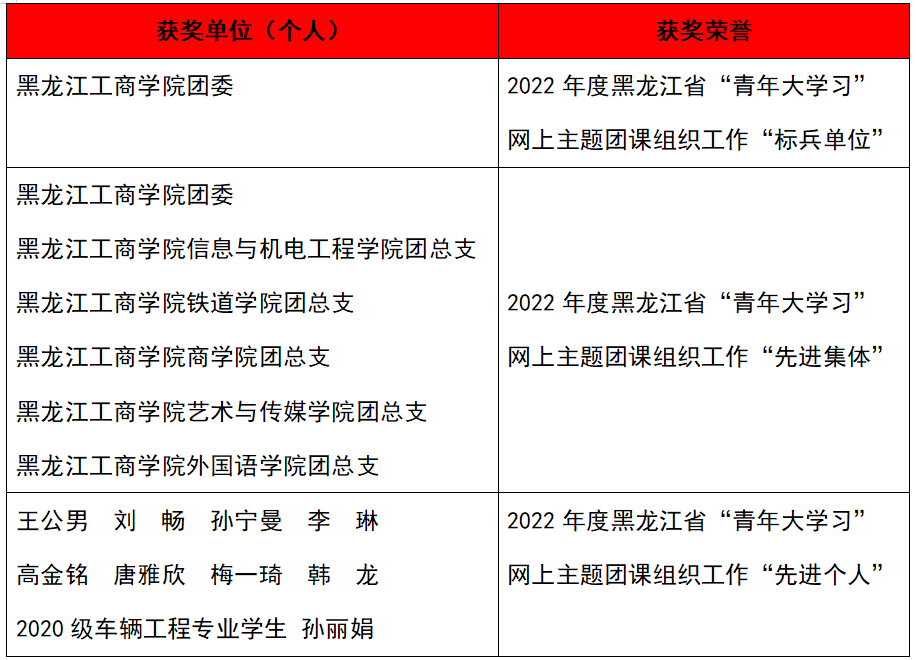 近日,团省委发布《关于表扬2022年度黑龙江省“青年大学习”网上主题团课组织工作标兵单位、先进单位、先进个人、先进集体的通报》,我校团委荣获2022年度黑龙江省“青年大学习”网上主题团课组织工作“标兵单位”荣誉称号;校团委、信息与机电工程学院团总支等6个团组织荣获2022年度黑龙江省“青年大学习”网上主题团课组织工作“先进集体”荣誉称号;唐雅欣、李琳、孙丽娟等9位师生负责人荣获2022年度黑龙江省“青年大学习”网上主题团课组织工作“先进个人”荣誉称号。