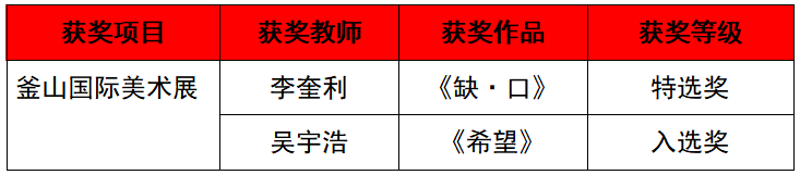 日前,釜山国际美术展落下帷幕,此次活动吸引了来自中国、日本、韩国的著名美术专业师生参展,共投稿408幅作品,最终194幅作品入选。我校艺术与传媒学院教师李奎利荣获釜山国际美术展特选奖,吴宇浩荣获釜山国际美术展入选奖。
