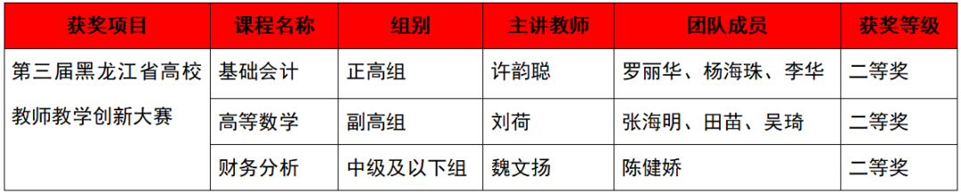 近日,由省教育厅主办的第三届黑龙江省高校教师教学创新大赛暨第三届全国高校教师教学创新大赛(龙江赛区)选拔赛落下帷幕,大赛历时4个月,经全省高校选拔推荐,共有496门课程参加省赛,网络评审后131门课程入围现场赛。经过激烈角逐,我校教师喜获大赛二等奖3项。在此之前,我校教师曾在前两届省高校教师教学创新大赛中喜获三等奖2项,本届大赛我校在获奖等级和数量上均有新的突破。