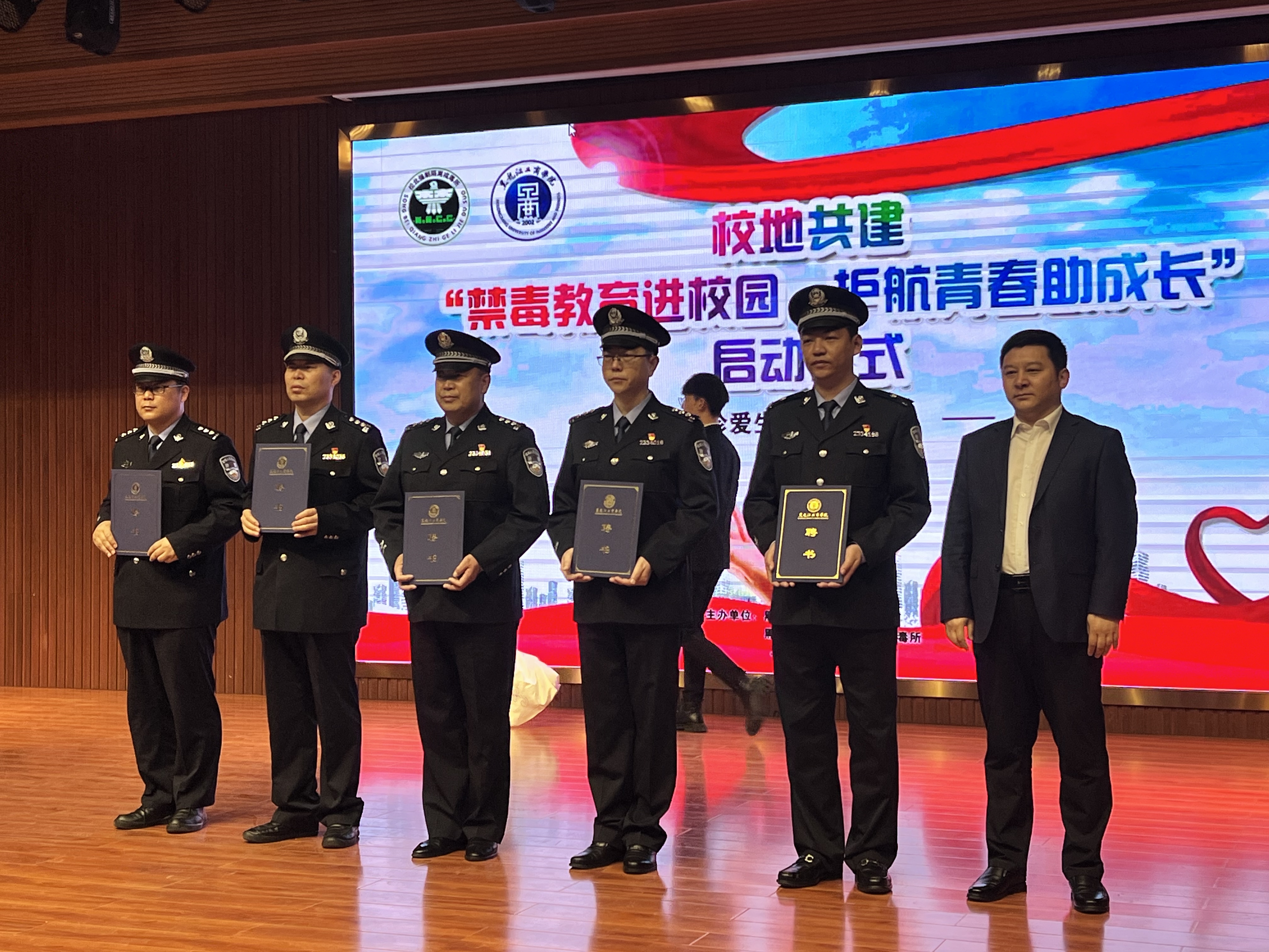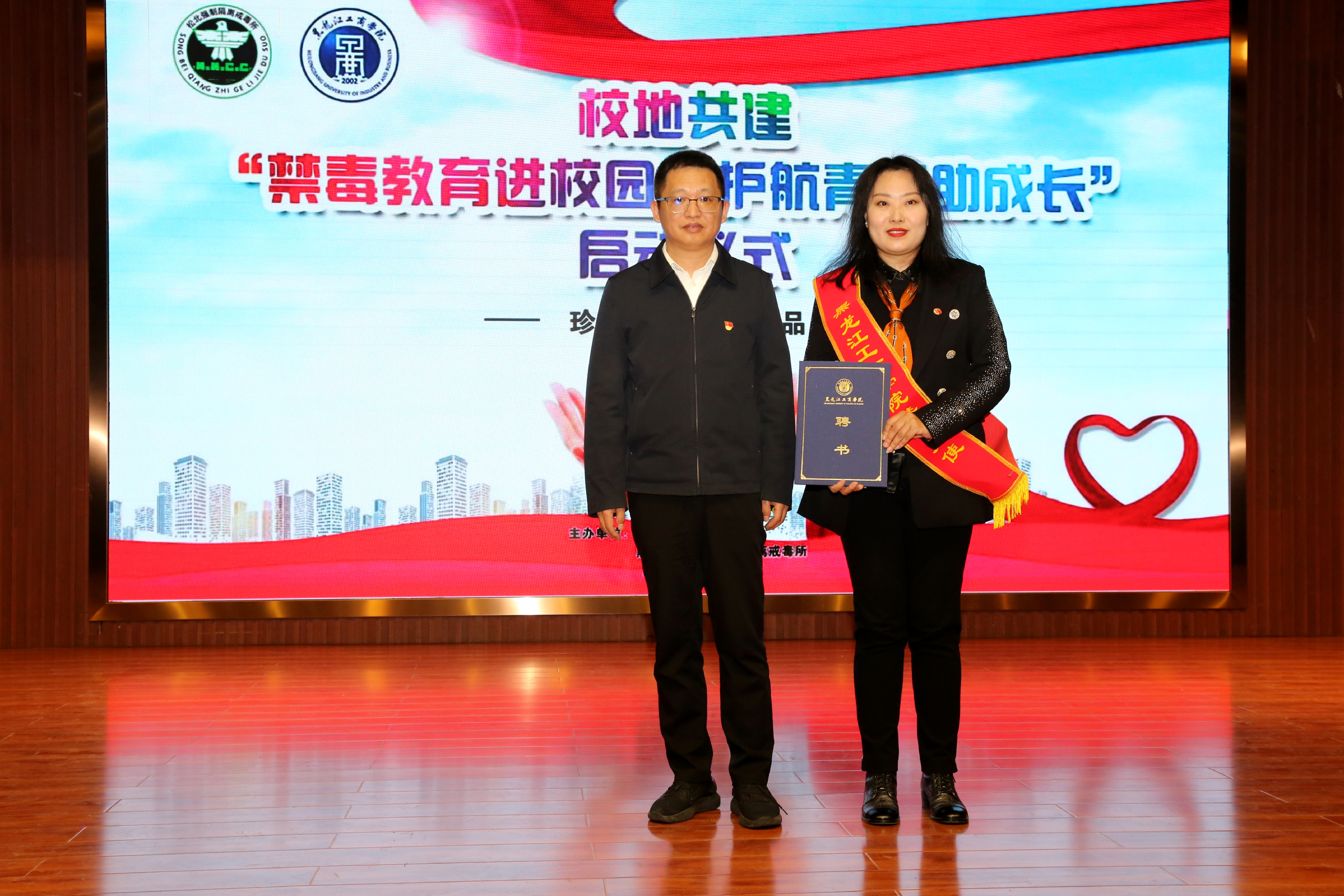 注:松北强制隔离戒毒所党委书记、所长于洪波向校团委书记张玉娜颁发“禁毒大使”聘书