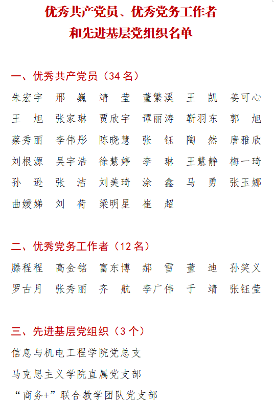 在全校深入开展学习贯彻习近平新时代中国特色社会主义思想主题教育,喜迎中国共产党成立102周年之际,为表彰先进、弘扬正气,激励广大党员和各级党组织奋勇争先、建功立业,学校党委印发通知,决定表彰优秀共产党员34名、优秀党务工作者12名和先进基层党组织3个。