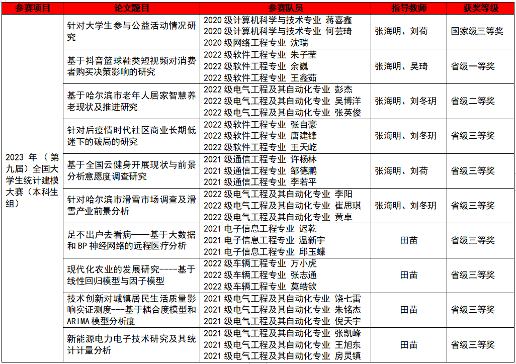 全国大学生统计建模大赛是全国普通高校大学生竞赛入榜赛事,旨在倡导学习统计、应用统计的良好氛围。自大赛开赛以来,在信息与机电工程学院和铁道学院的鼎力支持下,由基础教学部负责组织实施,统筹谋划、高效备赛,指导两个学院学生科学建模,规范论文写作,通过比赛努力提高工科学生数据挖掘、数据分析、运用统计方法及计算机技术处理数据的能力。发挥跨专业融合、交流的优势,先期,基础教学部指导学生在全国大学生数学建模竞赛(黑龙江赛区)和东北三省数学建模联赛中喜获17项大奖。学校将坚持以赛促学、以赛促教、以赛促创,打造更多的跨学科合作创新平台,为优秀人才脱颖而出创造更多条件。