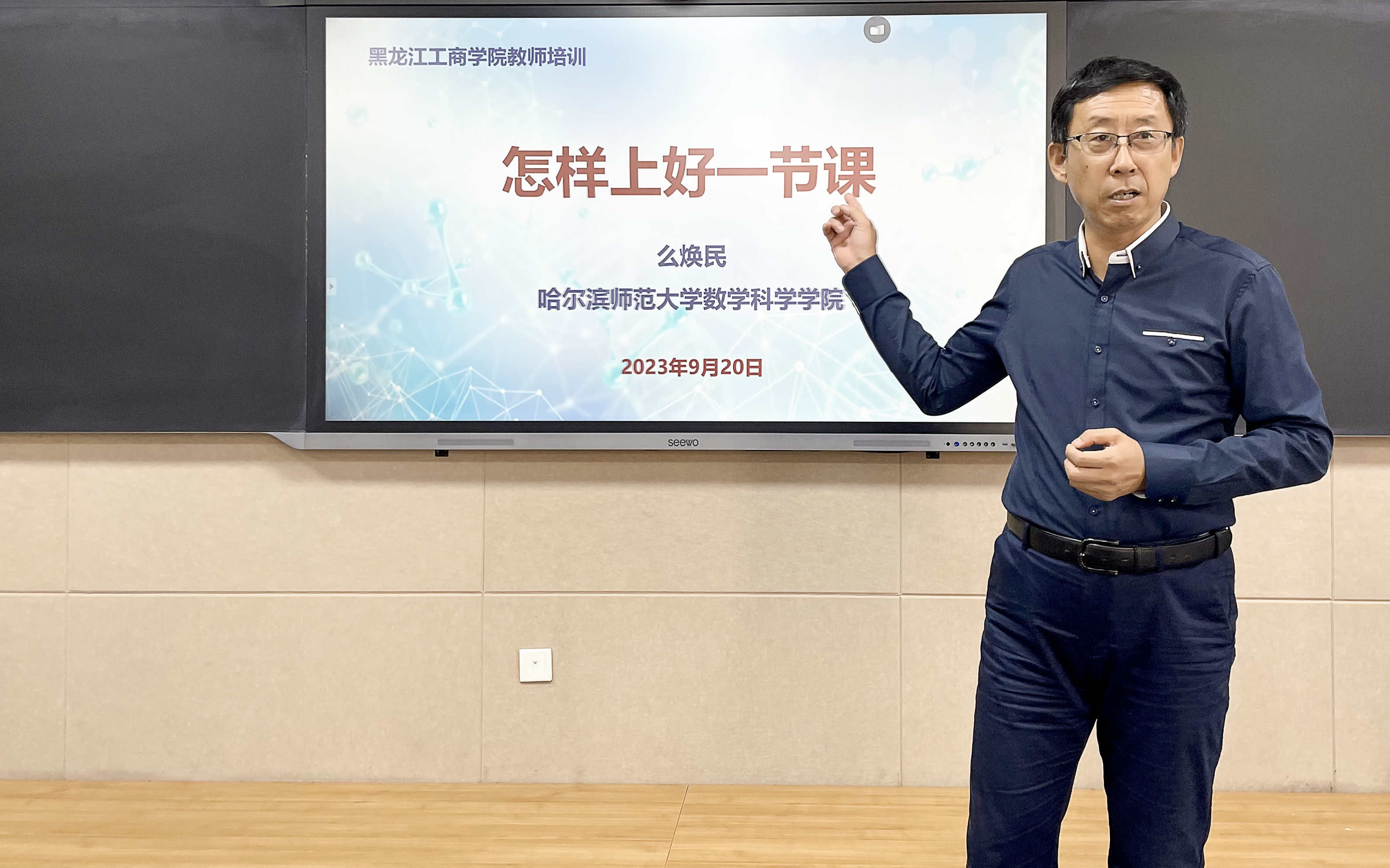 么焕民,哈尔滨师范大学二级教授,硕士生导师。他以“怎样上好一节课”为主题,从课堂教学基本要素、教学内容设计、教案准备、有机融入思政元素四方面展开。他指出,教师充当教学过程的设计者和指导者,学生是学习活动的主体,教学内容设计要解决教学中的“痛点”问题,点燃学生学习动力,唤醒学生主体地位,引领学生健康成长。