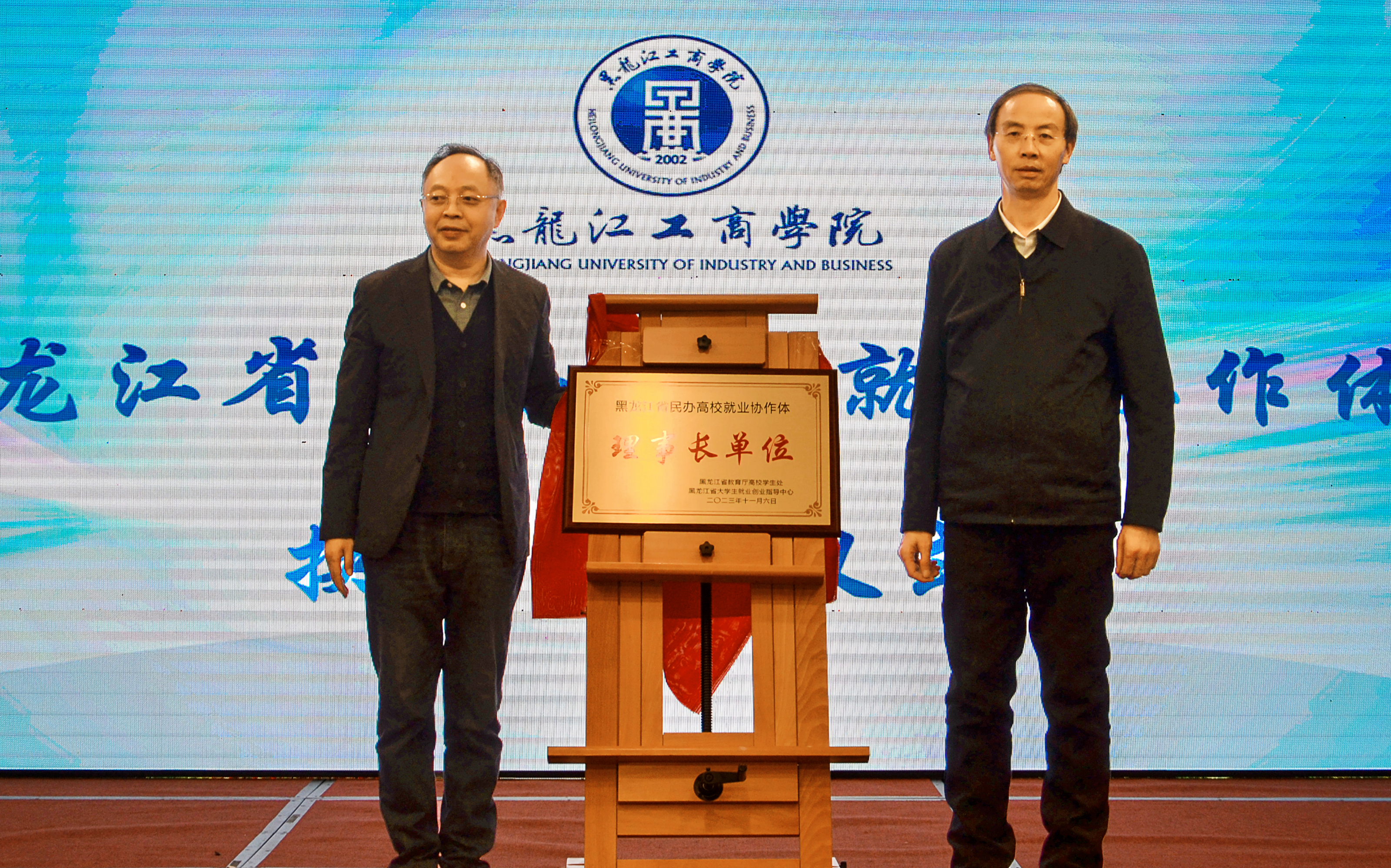 注:郭承哲和徐德荣共同为“黑龙江省民办高校就业协作体理事长单位”揭牌