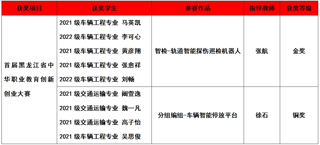 日前,由省委统战部、省教育厅、省人社厅指导,省中华职业教育社主办的首届黑龙江省中华职业教育创新创业大赛落下帷幕。由我校铁道学院派出的两个“双创”项目团队,从全省43所院校的126个项目中脱颖而出,最终获得大赛金奖和铜奖的好成绩。