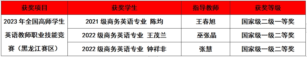 日前,由黑龙江省高师院校外语教学研究协作组主办,牡丹江师范学院承办的2023年全国高师学生英语教师职业技能竞赛(黑龙江赛区)决赛落下帷幕,经过激烈角逐,外国语学院学生最终获得国家级二级一等奖1项和国家级一级二等奖2项的好成绩。