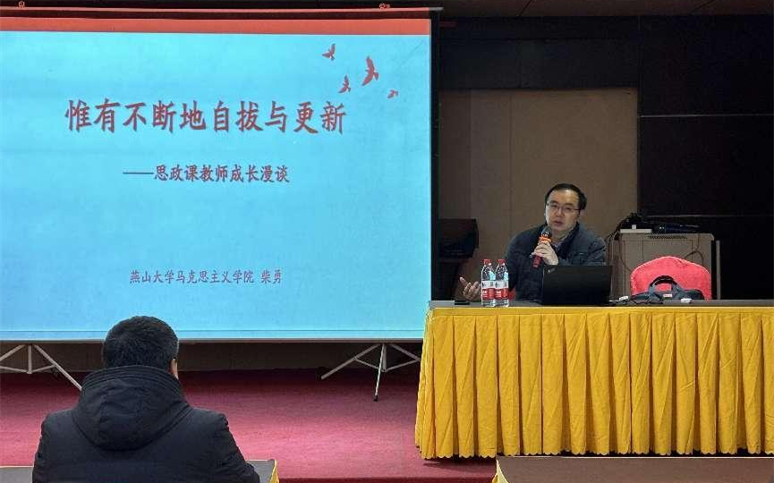 研学团一行还来到燕山大学,邀请燕大马克思主义学院院长、教育部高校思政课教指委中国近现代史纲要分教指委委员长柴勇教授作题为《唯有不断地自拔与更新——思政教师成长漫谈》的专题讲座,启发教师在在专业思政框架下深化课程思政教学,从中华优秀传统文化的丰富哲学思想、人文精神、道德理念中汲取丰厚育人养分。