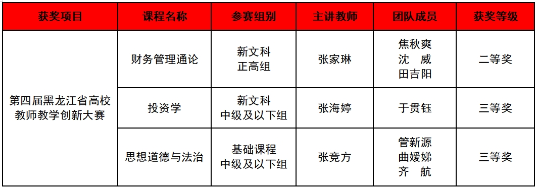 日前,第四届黑龙江省高校教师教学创新大赛暨全国高校教师教学创新大赛选拔落下帷幕。经过激烈角逐,我校张家琳教师团队获新文科正高组二等奖、张海婷教师团队获新文科中级及以下组三等奖、张竞方教师团队获基础课程中级及以下组三等奖。
