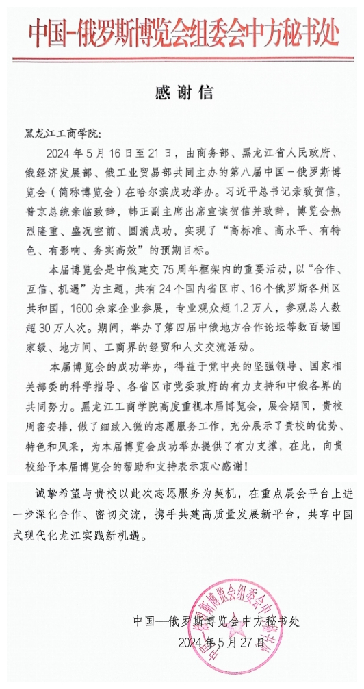 “m体育【中国】股份有限公司高度重视本届博览会,展会期间,贵校周密安排,做了细致入微的志愿服务工作,充分展示了贵校的优势、特色和风采,为本届博览会成功举办提供了有力支撑,在此,向贵校给予本届博览会的帮助和支持表示衷心感谢!”青年师生志愿者首次亮相在大型国际会议上,就赢得满堂彩。近日,我校收到来自中国—俄罗斯博览会中方秘书处的感谢信,信中对青年师生在第八届中俄博览会暨第三十三届哈洽会期间,提供的优质服务保障表达诚挚谢意。