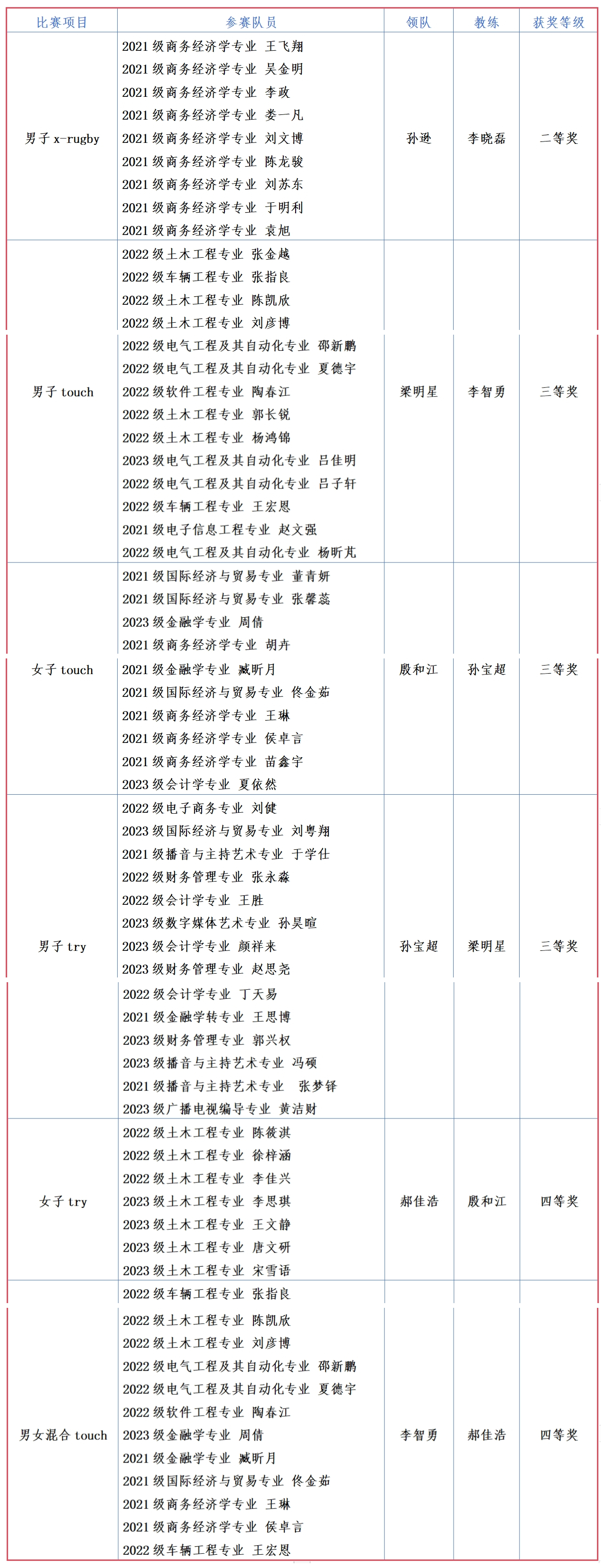 注:省青少年橄榄球锦标赛由省体育局、省教育厅主办,来自全省16所学校的42支队伍300余名运动员参加比赛,我校六支球队55名运动员强化体能训练、战术演练和团队磨合,在赛场上展现出顽强的拼搏精神和极高的竞技水平。