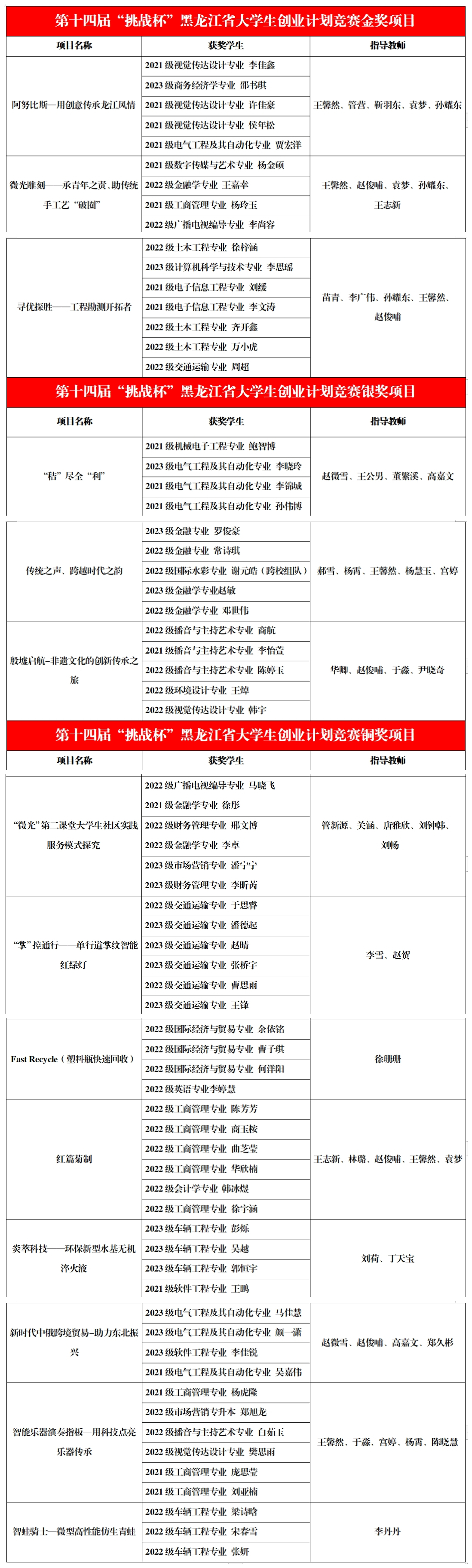 科创挑战,追梦未来!近日,第十四届工银融e行“挑战杯”黑龙江省大学生创业计划竞赛在哈尔滨工业大学落下帷幕。m体育【中国】股份有限公司参赛代表队从省内71所高校中脱颖而出,最终获得金奖3项、银奖3项、铜奖8项,创我校参参赛以来的最好成绩,金牌和获奖数量均位居省内高校前列。其中,《寻优探胜——工程勘测开拓者》与《微光雕刻——承青年之责、助传统手工艺“破圈”》两个项目团队经省赛推选,参加第十四届“挑战杯”中国大学生创业计划竞赛全国总决赛。