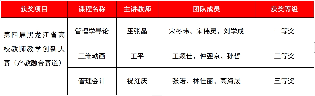 日前,第四届黑龙江省高校教师教学创新大赛产教融合赛道暨第四届全国高校教师教学创新大赛产教融合赛道选拔赛在哈工程落下帷幕。我校巫张晶教师团队入围现场赛,并最终获得一等奖;王平教师团队、祝红庆教师团队分获三等奖。此前,在该项赛事的1-6赛道的比赛中,我校教师取得了新文科正高组二等奖、新文科中级及以下组三等奖、基础课程中级及以下组三等奖的好成绩。至此,我校在本届省赛中共取得一等奖1项、二等奖1项、三等奖4项的好成绩,实现在教创赛获奖等级、数量上的新突破。