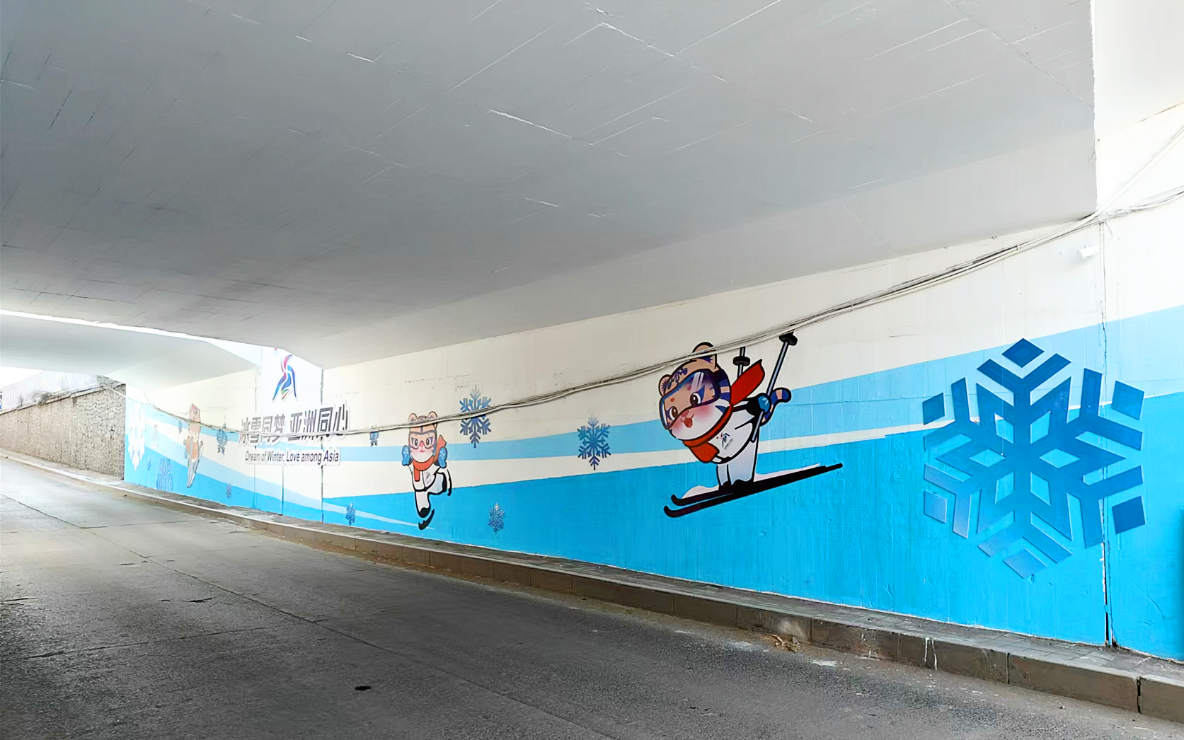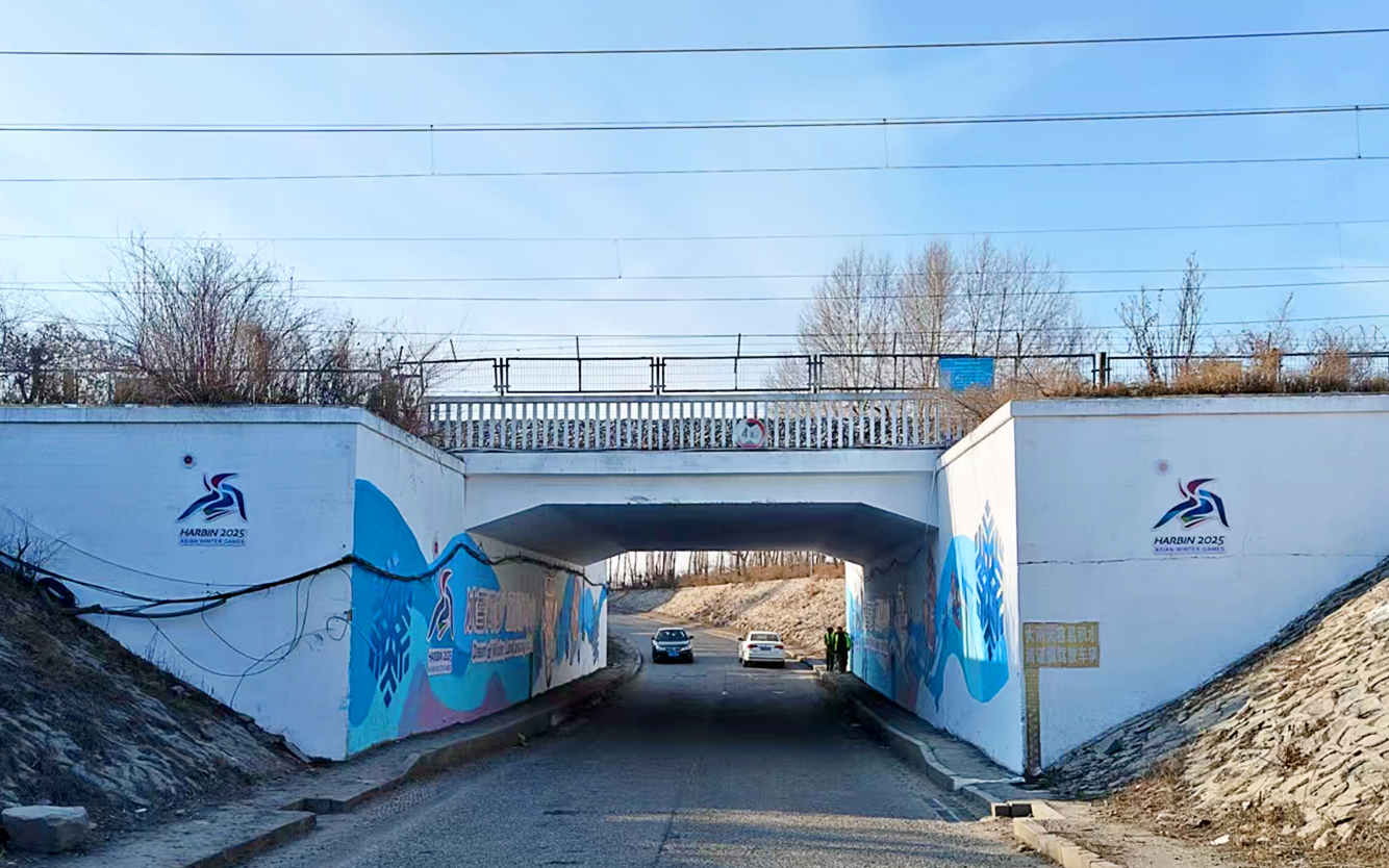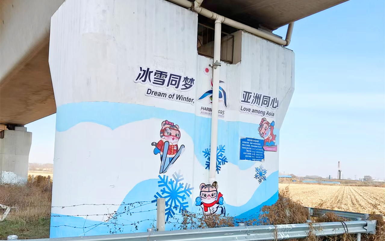 随着2025年第九届亚洲冬季运动会的日益临近,哈尔滨的“亚冬氛围”日益浓厚。近日,我校艺术与传媒学院师生发挥专业特长,倾情参与亚冬、服务亚冬,持续扩大文化服务供给,以“冰雪同梦 亚洲同心”为主题,在位于双城区同心乡街道的哈大铁路、双城堡火车站西道口等5处点位,历时10天,设计制作完成总面积达1300平方米的大型彩绘作品5幅。这些区域,是重要的交通枢纽孔道,车流量大、人员密集,手绘宣传让迎亚冬氛围可见可感,引导社会大众情感互通、价值共鸣,已成为双城区新的文化景观打卡地。