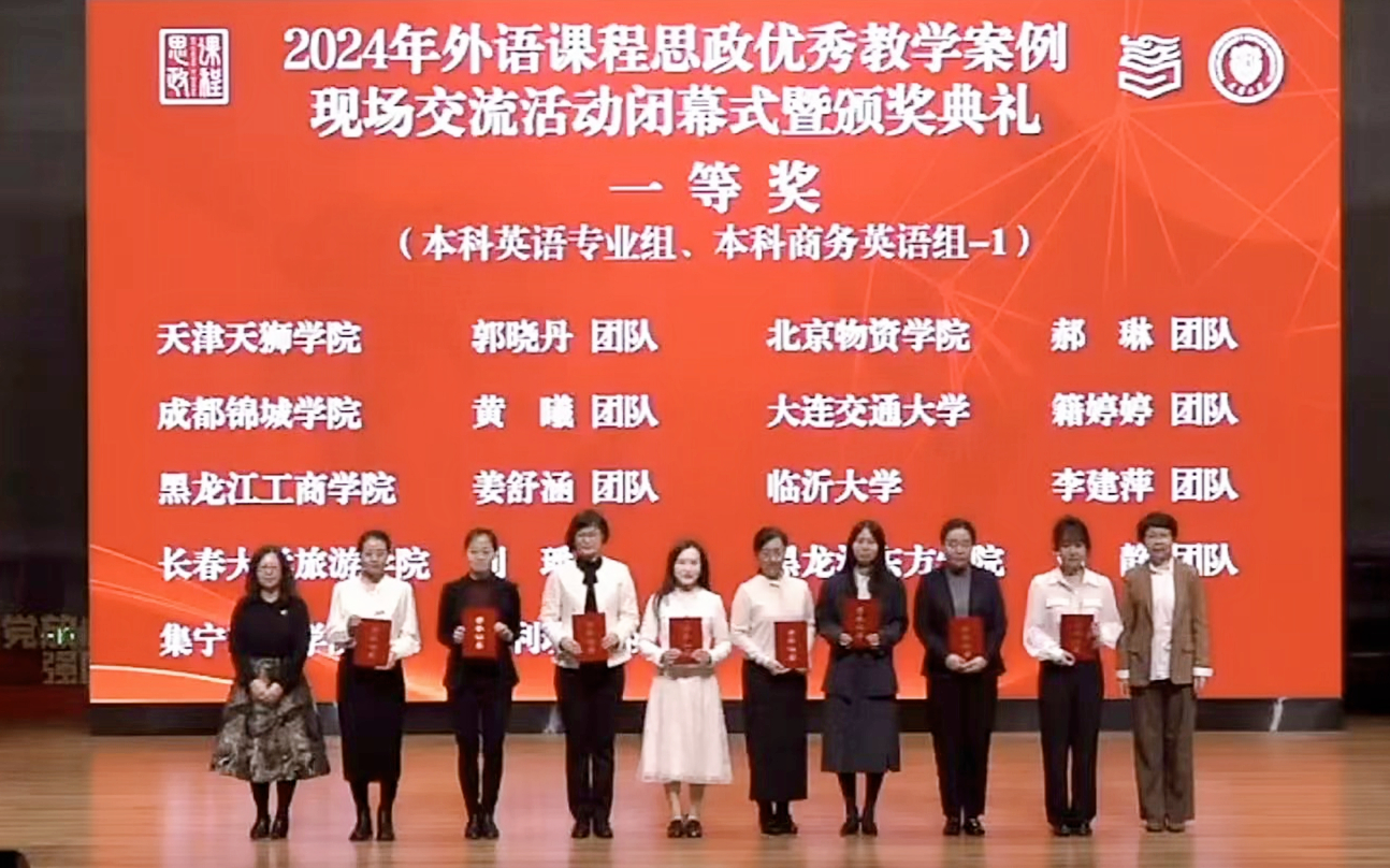 近日,由教育部高等学校大学外语教学指导委员会、高等教育出版社、全国高校教师网络培训中心与中国外语编辑部共同开展的“2024年高等学校外语课程思政优秀教学案例现场交流活动”在天津大学落下帷幕。我校外国语学院刘恩赐教师团队(成员:姜舒涵、李美、陈亚明)继荣获本科英语专业组省级特等奖后,代表黑龙江省参加大学英语专业组全国活动环节,最终获得全国一等奖。