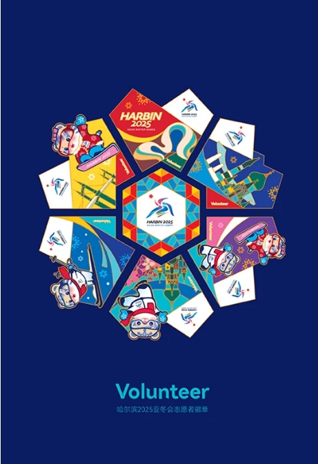 邓国梁老师设计的徽章作品《心心相映》喜获2025第九届亚冬会体育文化公益海报和志愿者徽章创意设计大赛金奖,并在第九届亚冬会倒计时100天主题活动期间正式确定为亚冬会志愿者徽章,对外发布推出。徽章主体图形设计以“心心相映”为核心构思,将Volunteer首写字母“V”与“心”的形状和雪花巧妙融合。徽章的每一颗心形由冰雪凝结而成,将亚冬会会徽、吉祥物与哈尔滨特有的建筑特色符号完美的融合在一起,六颗心形巧妙地围合成一朵绚丽的雪花,展现了冰城冰雪文化的独特魅力,更象征着志愿者们心手相连、共同追求体育梦想与荣耀的坚定信念。