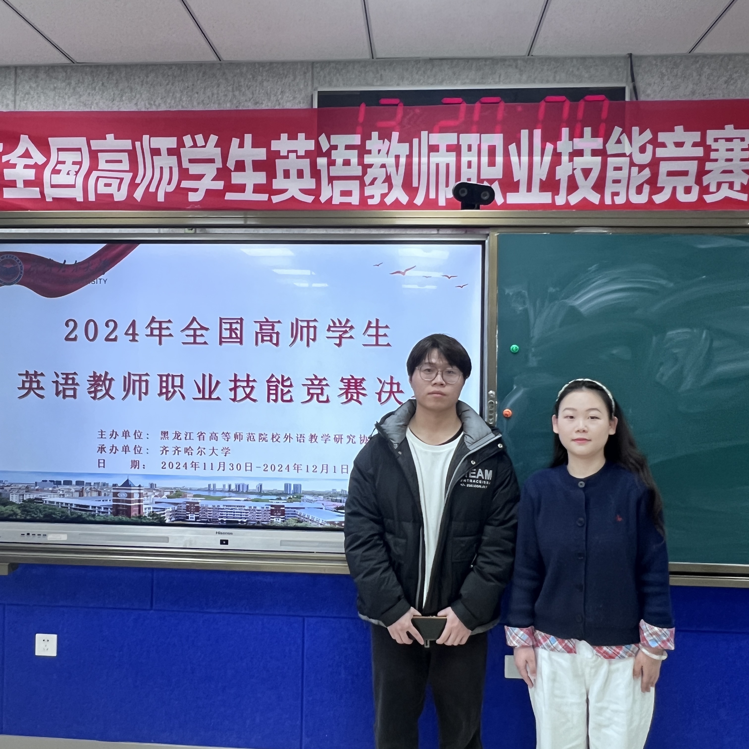 近日,由全国高等师范院校外语教学研究协作组主办,齐齐哈尔大学承办的全国高师学生英语教师职业技能竞赛(黑龙江赛区)决赛落下帷幕。我校外国语学院2022级英语专业何姝漩(指导教师巫张晶)和2023级英语专业牛雲龍(指导教师姜舒涵、吴梦)分别喜获国家级二级一等奖和国家级一级一等奖的好成绩。(注:一级竞赛面向本科一、二年级学生;二级竞赛面向本科三、四年级学生及硕士研究生)