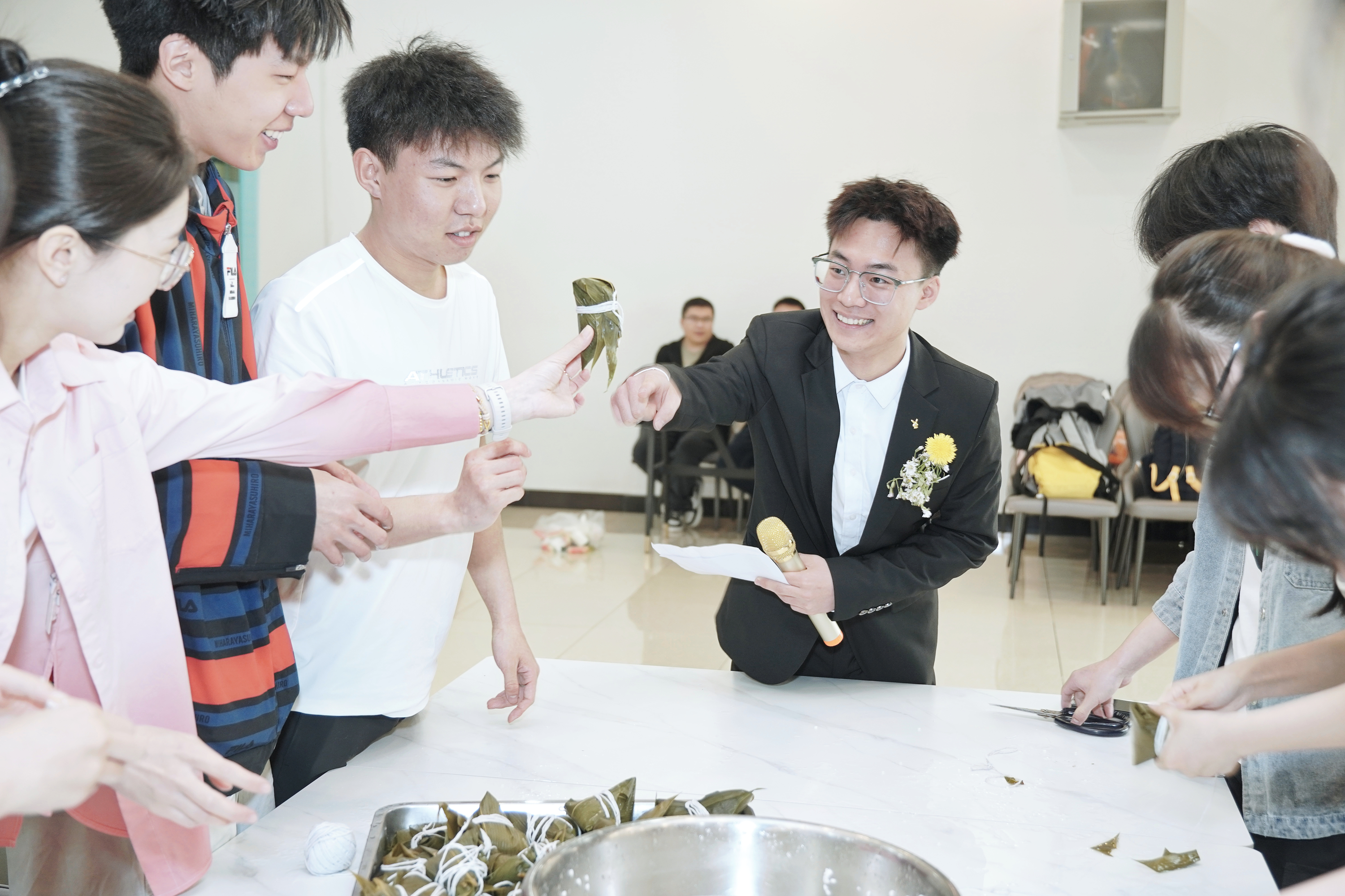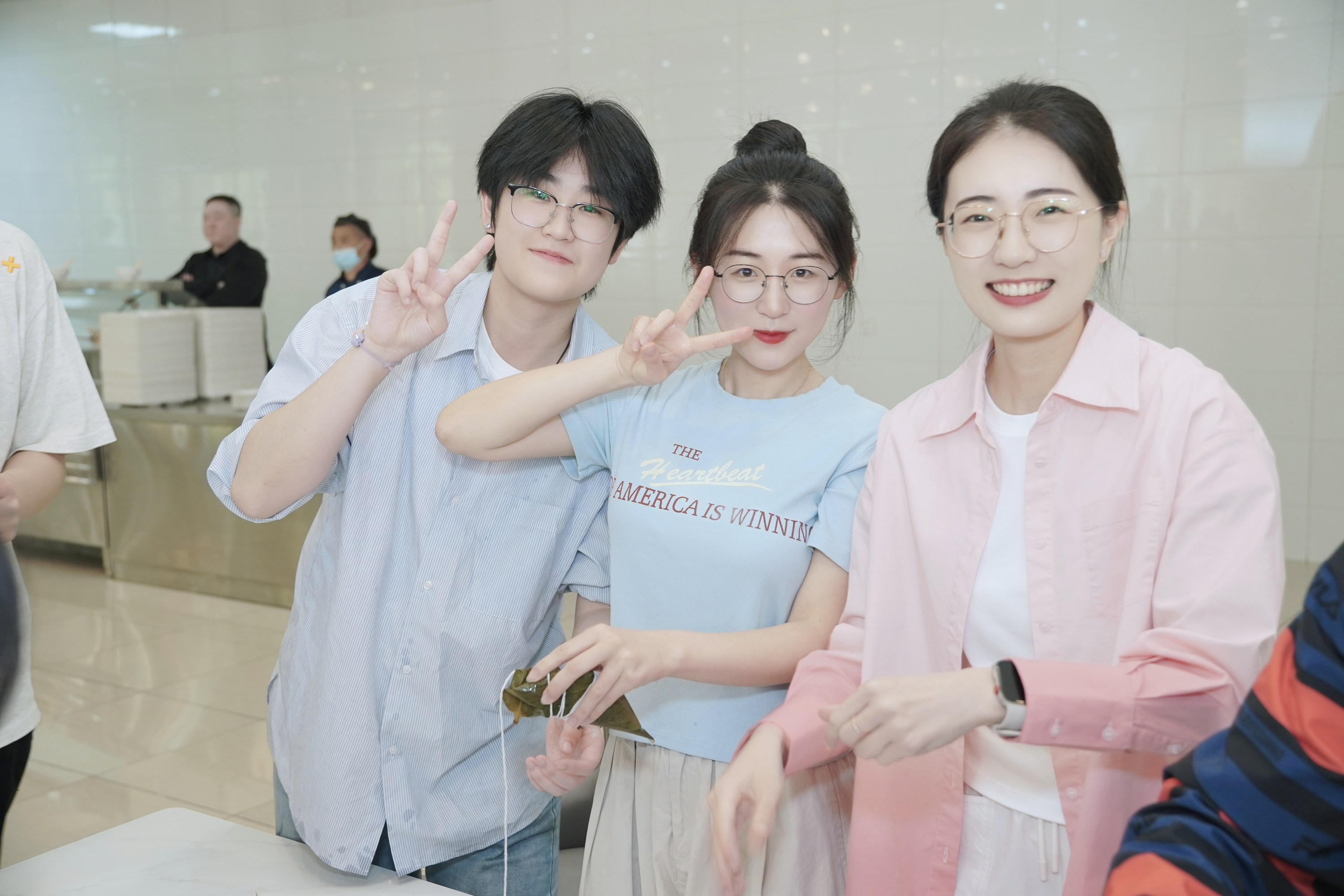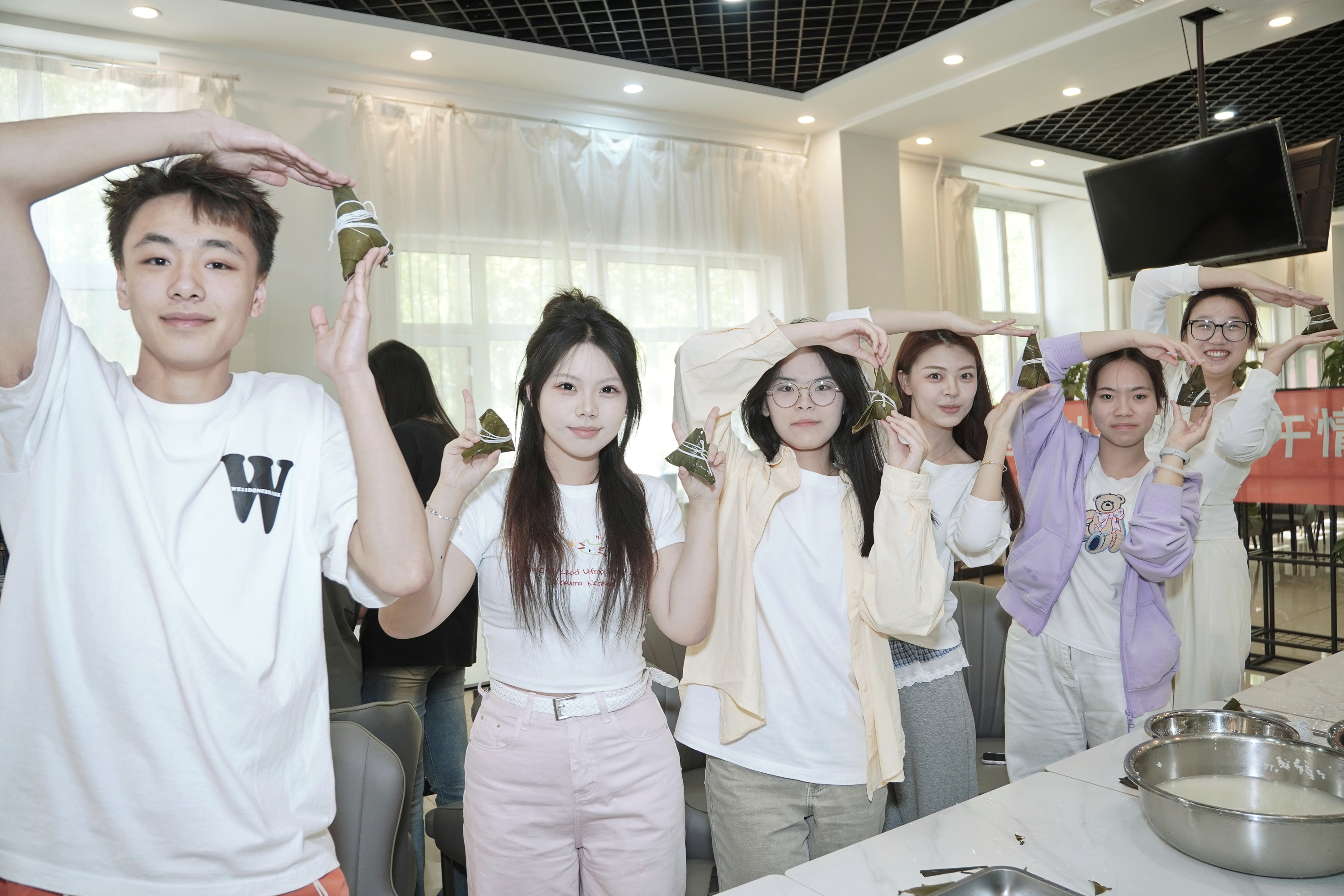 活动现场,食堂特备的新鲜粽叶、晶莹糯米与各式馅料琳琅满目。在食堂师傅的悉心指导下,同学们捋粽叶、填糯米、裹馅料、扎彩绳,翠绿的粽叶在指尖翻飞,饱满的糯米散发清香,一个个棱角分明、形态各异的粽子在欢声笑语中诞生。一家人围坐品尝亲手制作的香粽,共话佳节趣事,共享校园恬静美好;佩香囊、编五彩绳、画彩蛋,体悟中华文明隽永韵味,大家庭的融融暖意伴着香气弥漫。