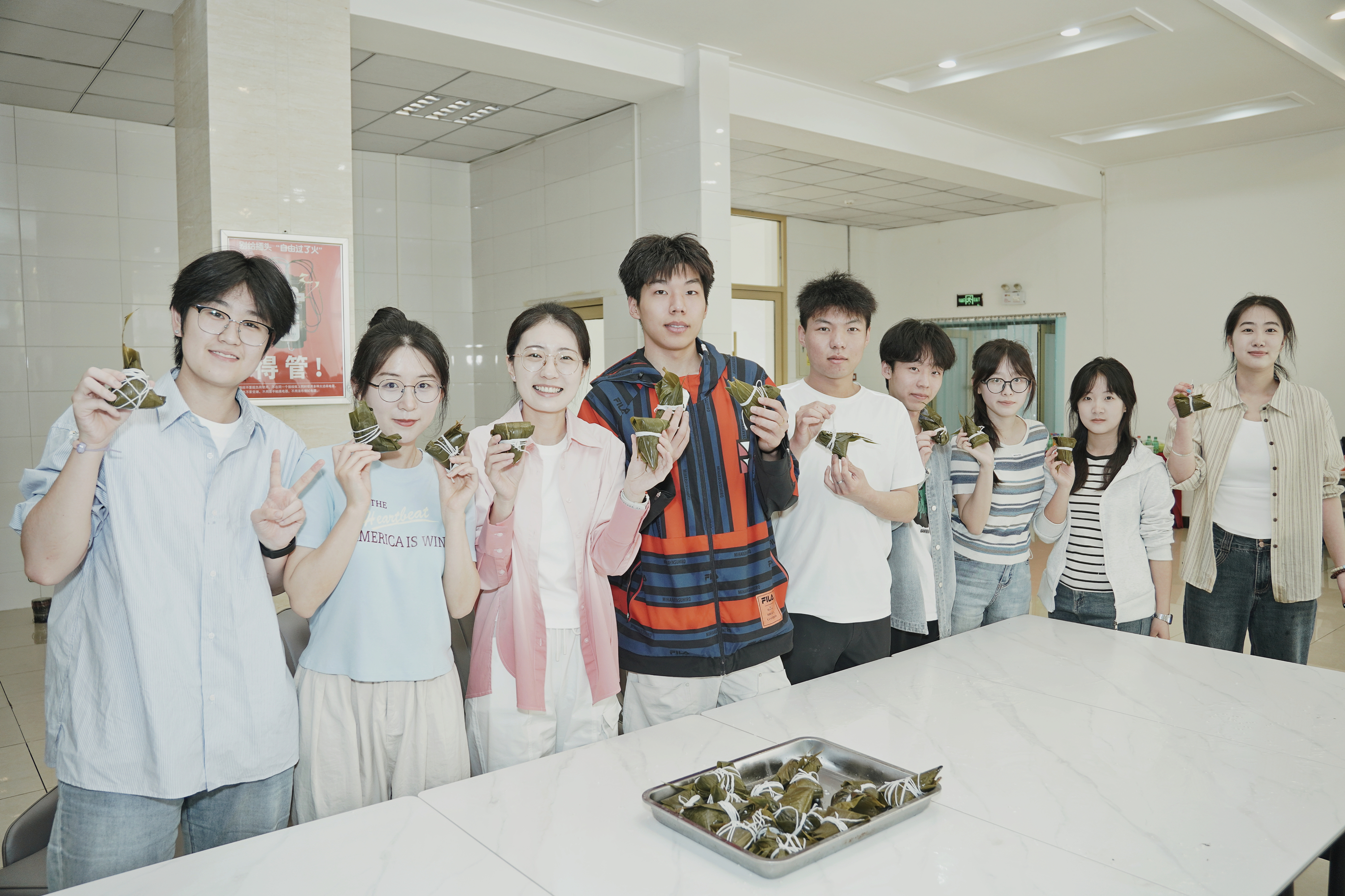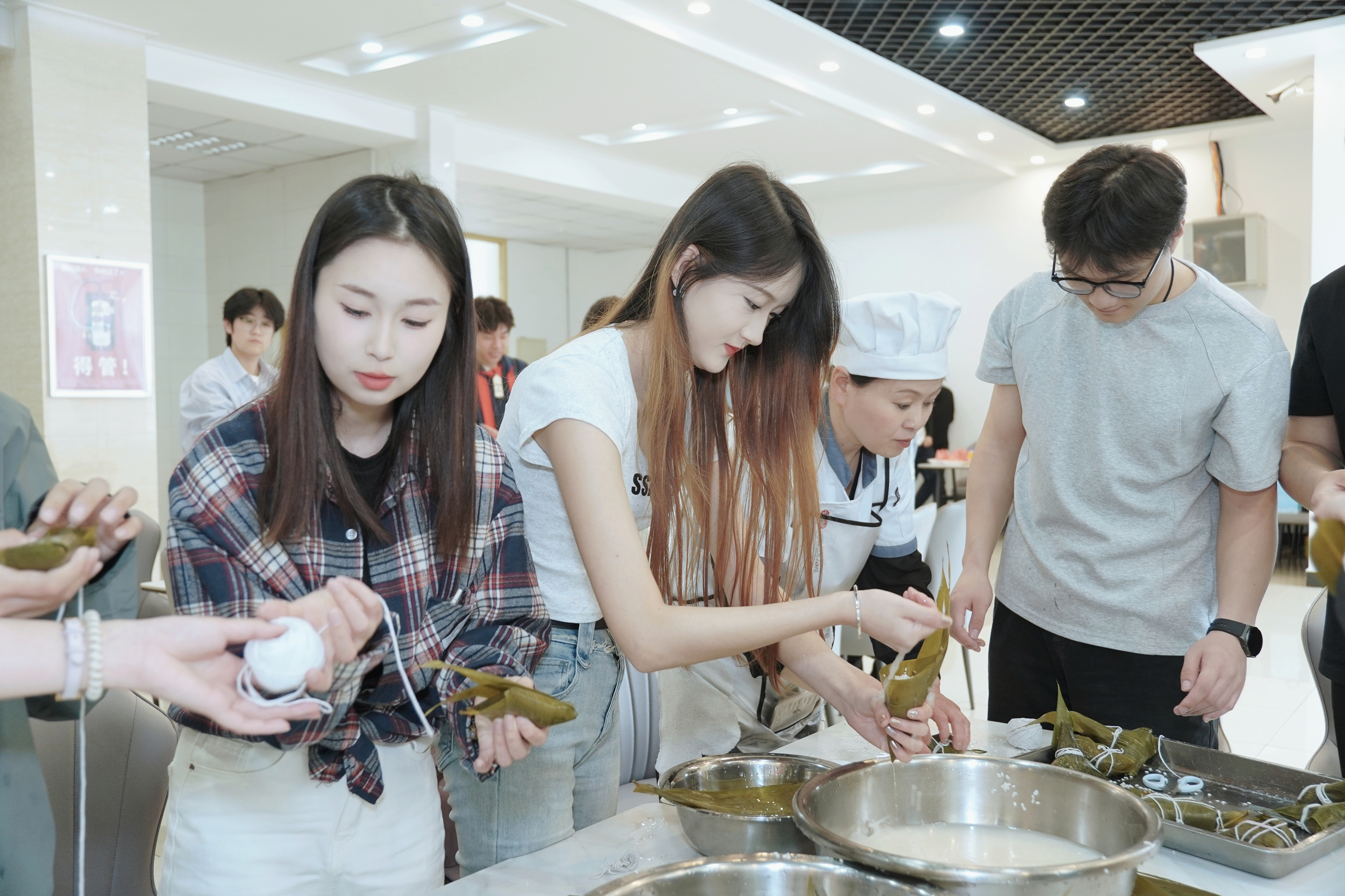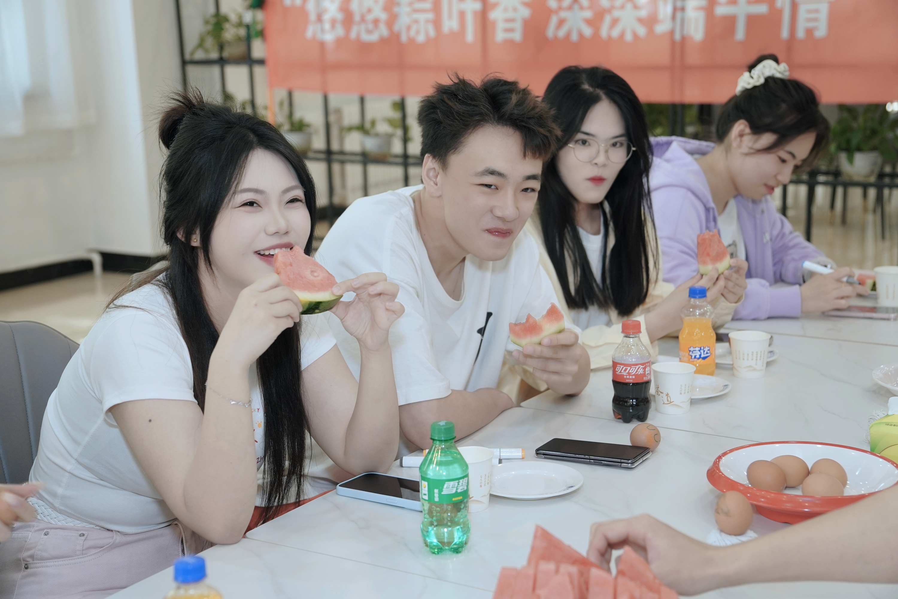 活动现场,食堂特备的新鲜粽叶、晶莹糯米与各式馅料琳琅满目。在食堂师傅的悉心指导下,同学们捋粽叶、填糯米、裹馅料、扎彩绳,翠绿的粽叶在指尖翻飞,饱满的糯米散发清香,一个个棱角分明、形态各异的粽子在欢声笑语中诞生。一家人围坐品尝亲手制作的香粽,共话佳节趣事,共享校园恬静美好;佩香囊、编五彩绳、画彩蛋,体悟中华文明隽永韵味,大家庭的融融暖意伴着香气弥漫。
