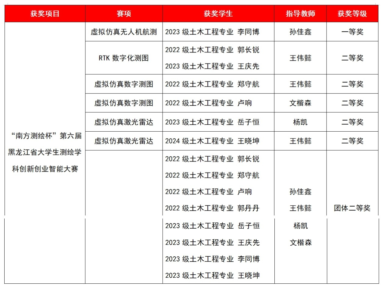 近日,由省教育厅和省测绘地理信息局联合主办的“南方测绘杯”第六届黑龙江省大学生测绘学科创新创业智能大赛圆满落幕。本次大赛吸引了来自全省35所高校的近500名学子同台竞技,充分展现了新时代测绘学子的风采与实力。我校智能制造与交通工程学院师生脱颖而出,共斩获个人赛一等奖1项、二等奖5项,以及团体二等奖1项。