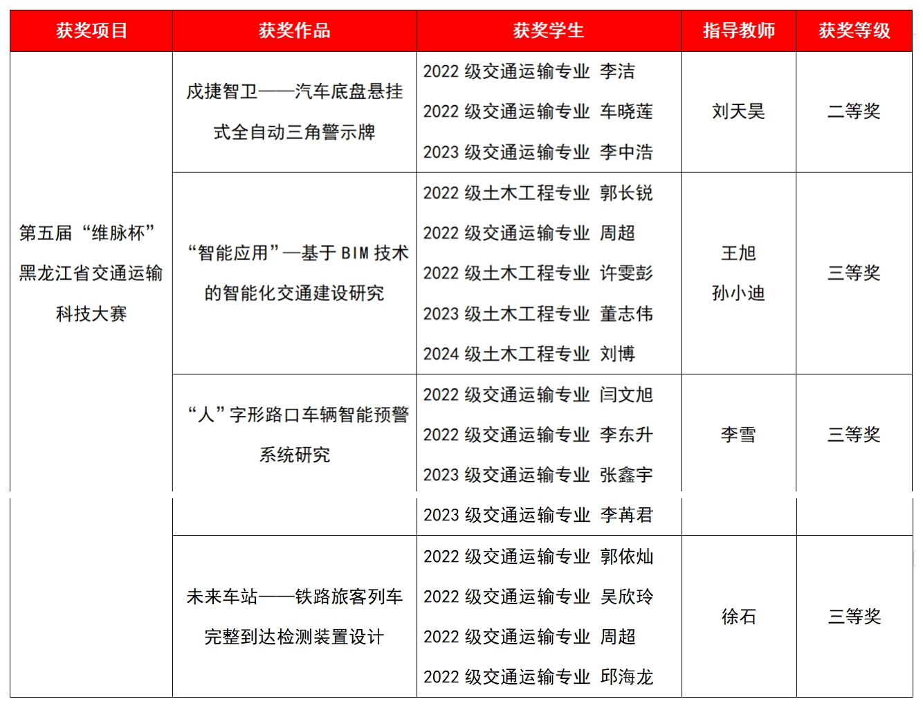近日,在第五届“维脉杯”黑龙江省交通运输科技大赛中,我校智能制造与交通工程学院师生传来喜讯,凭借扎实的专业功底和出色的创新能力,从全省众多高校的121件参赛作品中脱颖而出,一举斩获二等奖1项、三等奖3项的优异成绩。