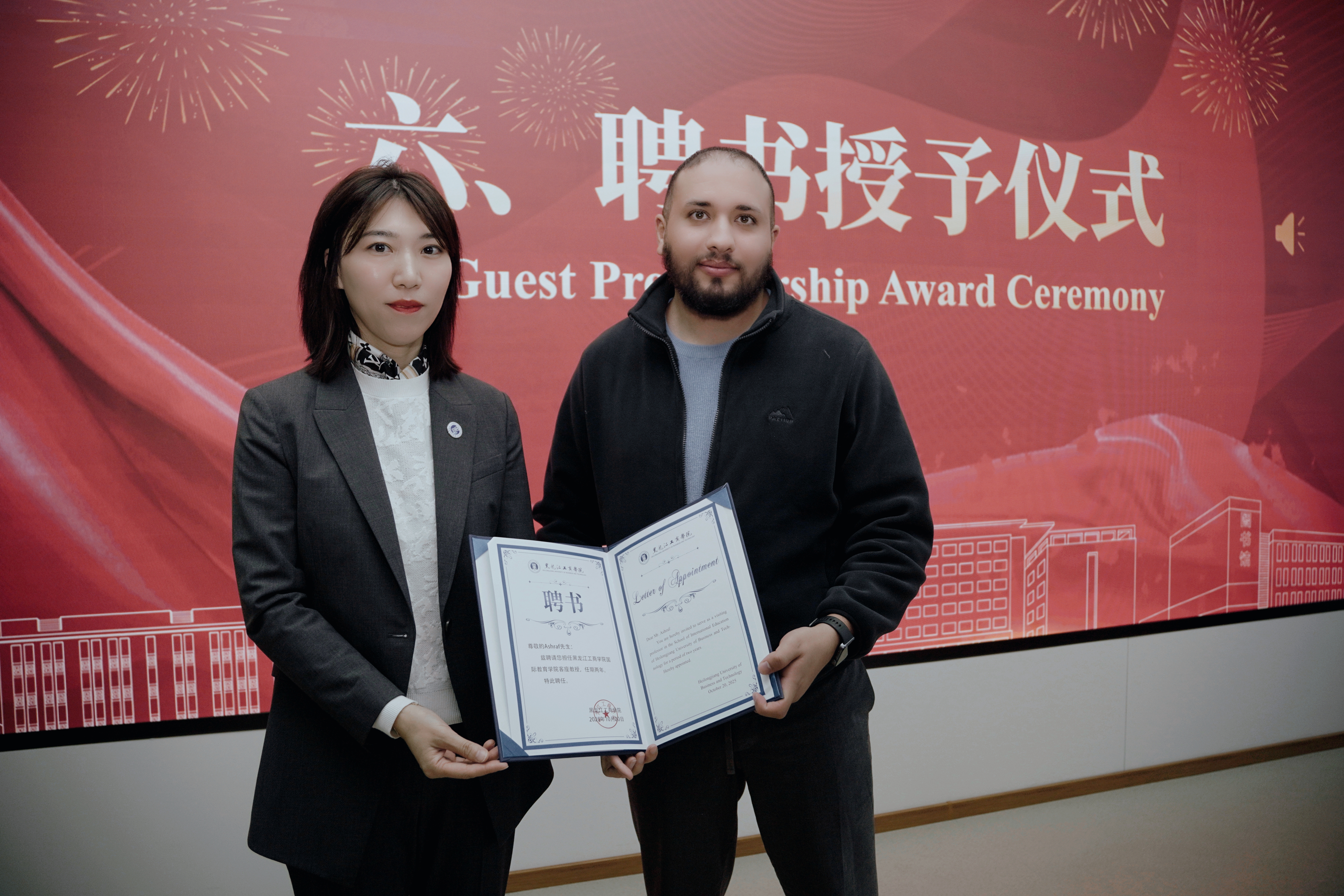 注:国际教育学院院长于胜楠为摩洛哥项目方代表Ashraf颁发客座教授聘书