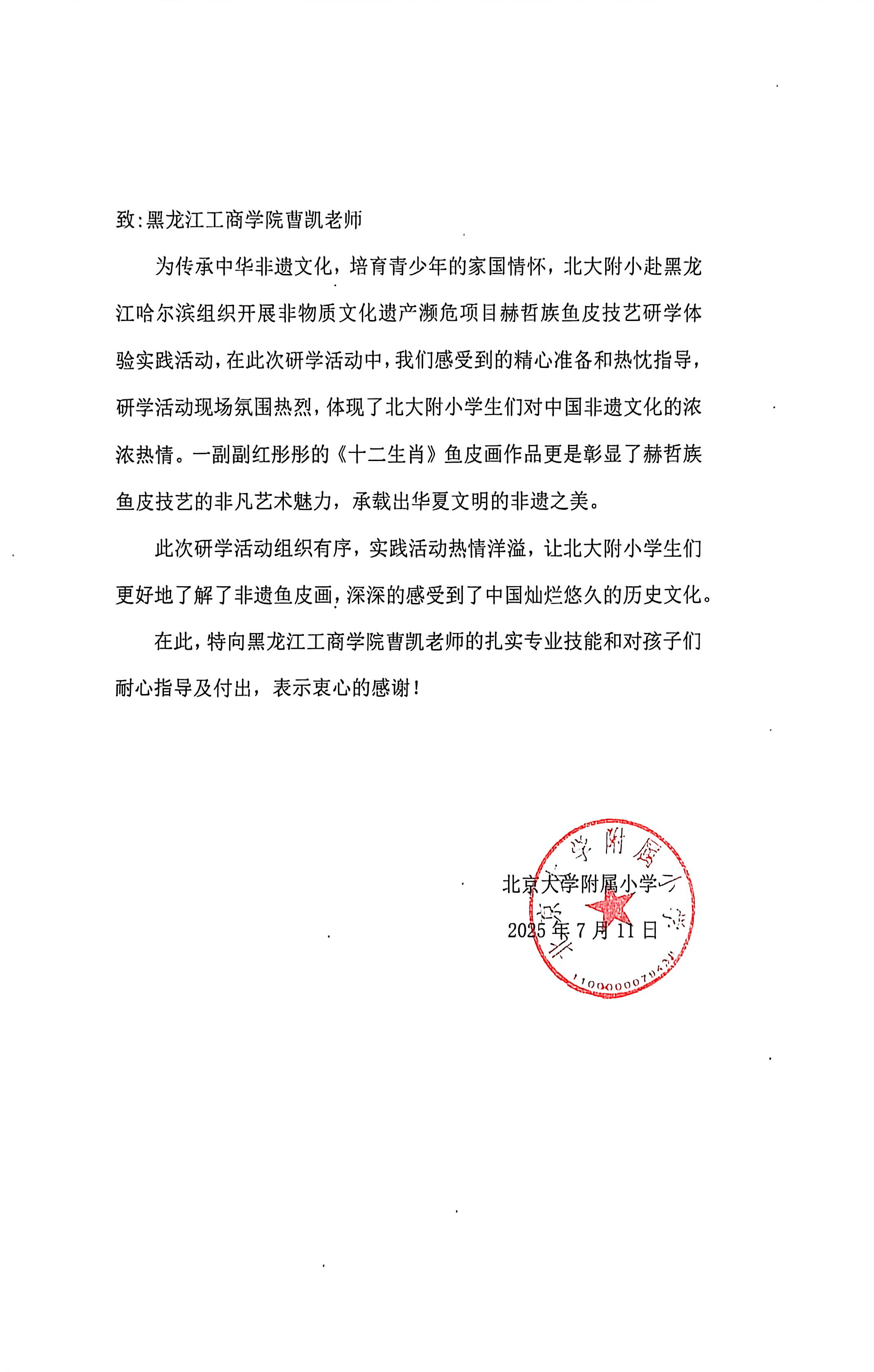 近日,艺术与传媒学院教师曹凯收到一封来自北京大学附属小学的感谢信,对其在研学活动中帮助师生沉浸式体验赫哲族鱼皮技艺表示衷心感谢。