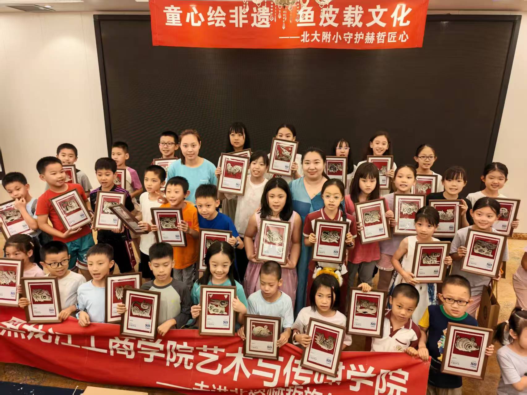 在最受期待的实践环节中,我校艺脉传薪社师生一对一指导,从构思设计到裁剪粘贴、从图案描绘到细节完善,每个步骤都呈现技艺魅力。当一幅幅融合传统技艺与现代创意的《十二生肖》鱼皮画邮票设计图呈现在眼前,孩子们的脸上洋溢着灿烂的笑容。