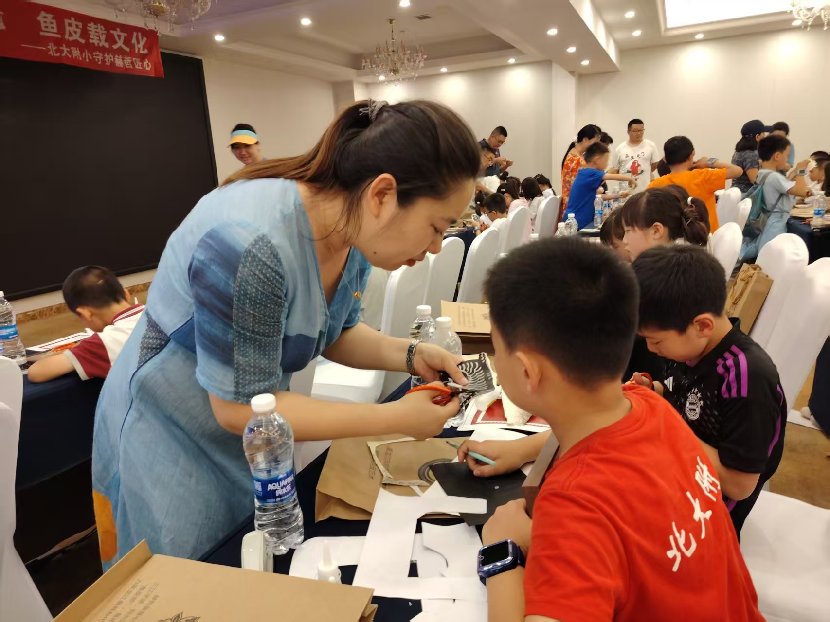 课堂上,曹凯通过播放渔猎生活纪录片、展示鱼皮样本,引导孩子们了解赫哲族独特的生活方式和鱼皮制作工艺。“赫哲人住在黑龙江、乌苏里江沿岸,鱼是他们的‘衣食父母’,鱼皮能做衣服,也能画出心里的故事。”在他生动的讲解下,孩子们饶有兴趣地触摸鱼皮,感受传统技艺的独特魅力。