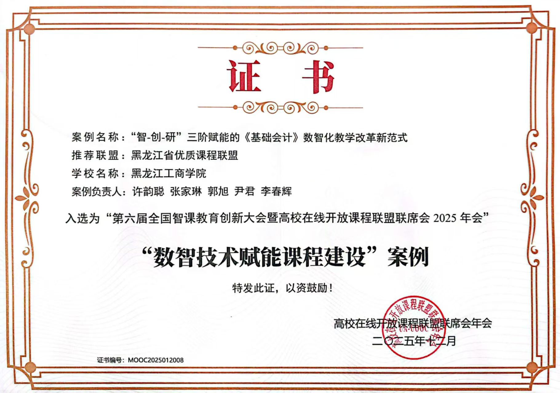 12月13日,第六届全国智课教育创新大会暨高校在线开放课程联盟联席会2025年年会在湖北武汉召开。大会在教育部高等教育司指导下,汇聚全国教育数字化领域的专家学者、高校管理者、一线名师及行业代表,聚焦人工智能赋能教育现代化与智慧课程建设。会上,我校申报的“‘智—创—研’三阶赋能的《基础会计》数智化教学改革新范式”从众多参评项目中脱颖而出,获评“数智技术赋能课程建设”优秀案例,并受邀在大会现场领奖。这一成果标志着学校在智慧课程建设领域实现了国家级奖项的突破,也是推进数智化教学改革的重要阶段性成果。